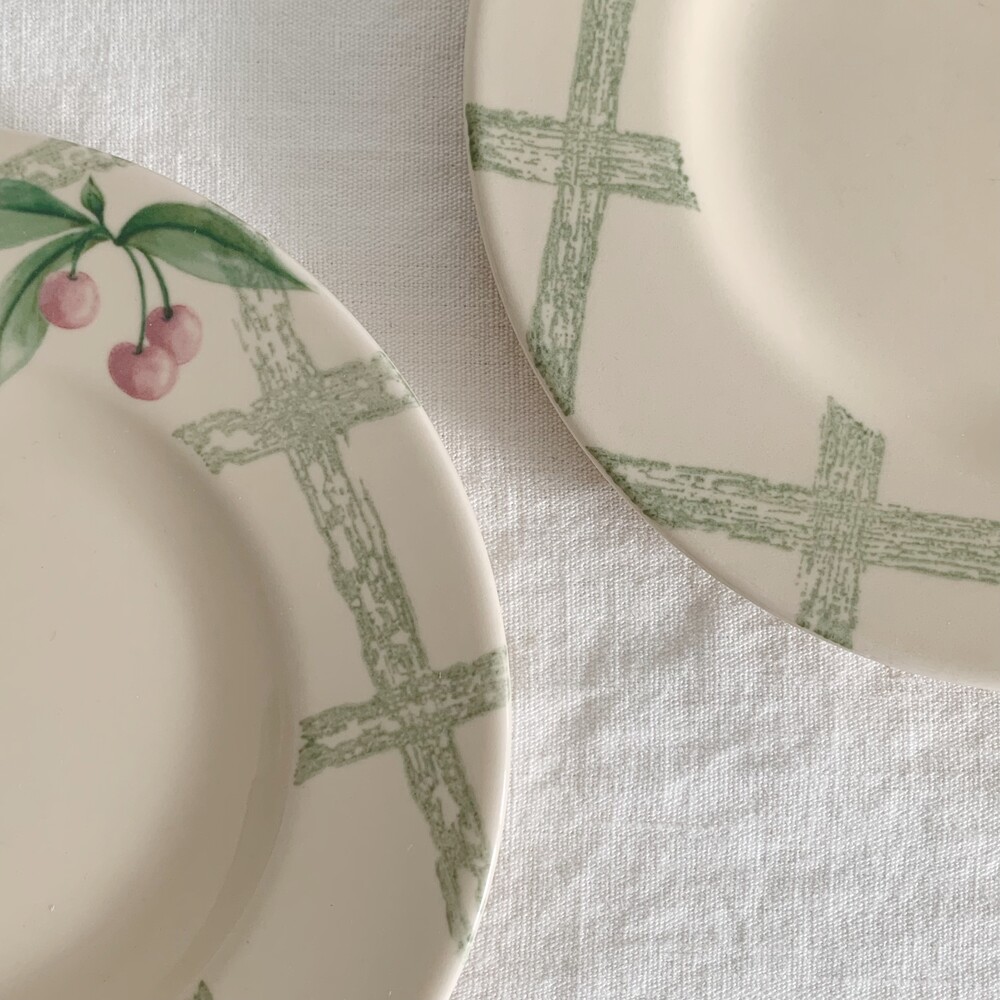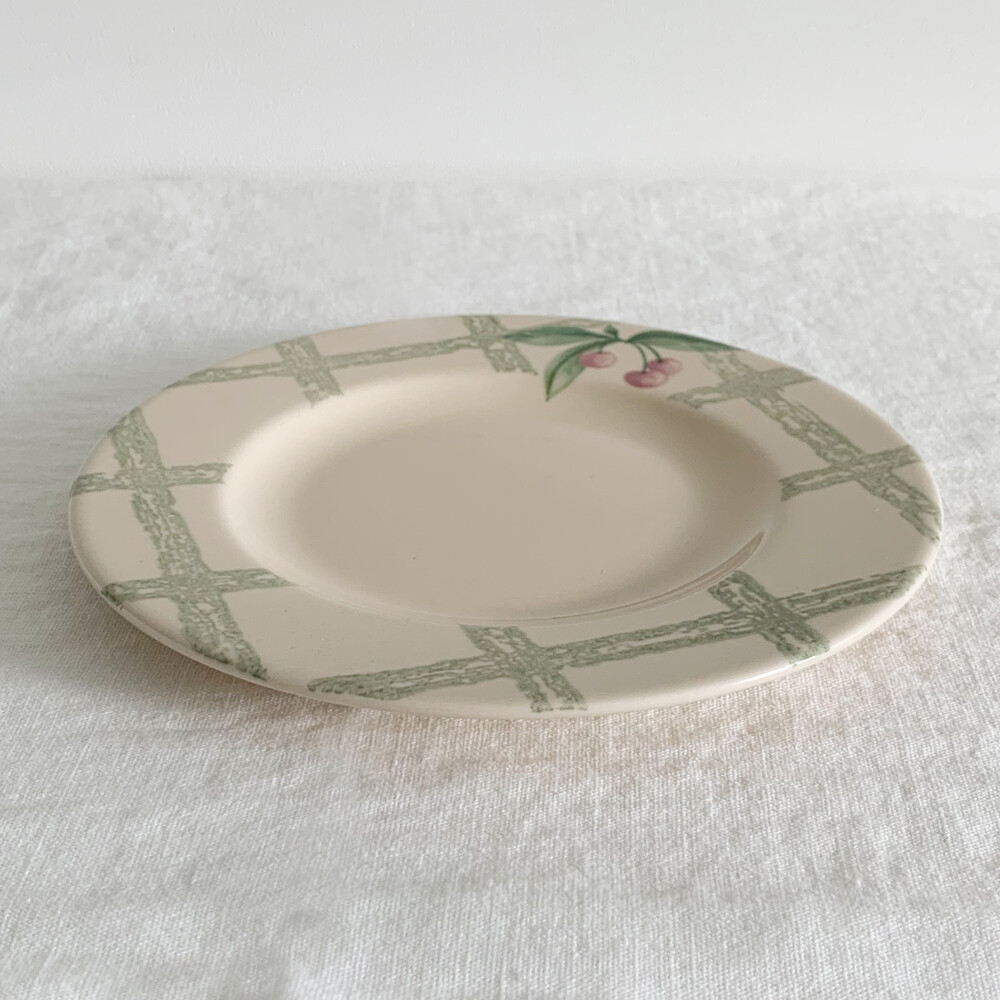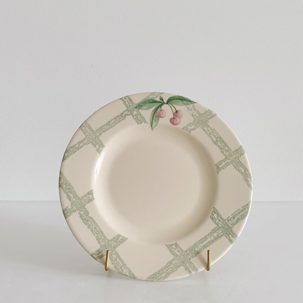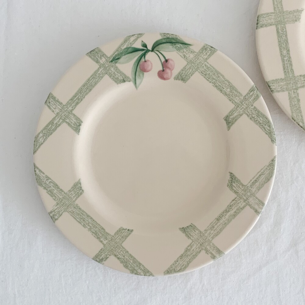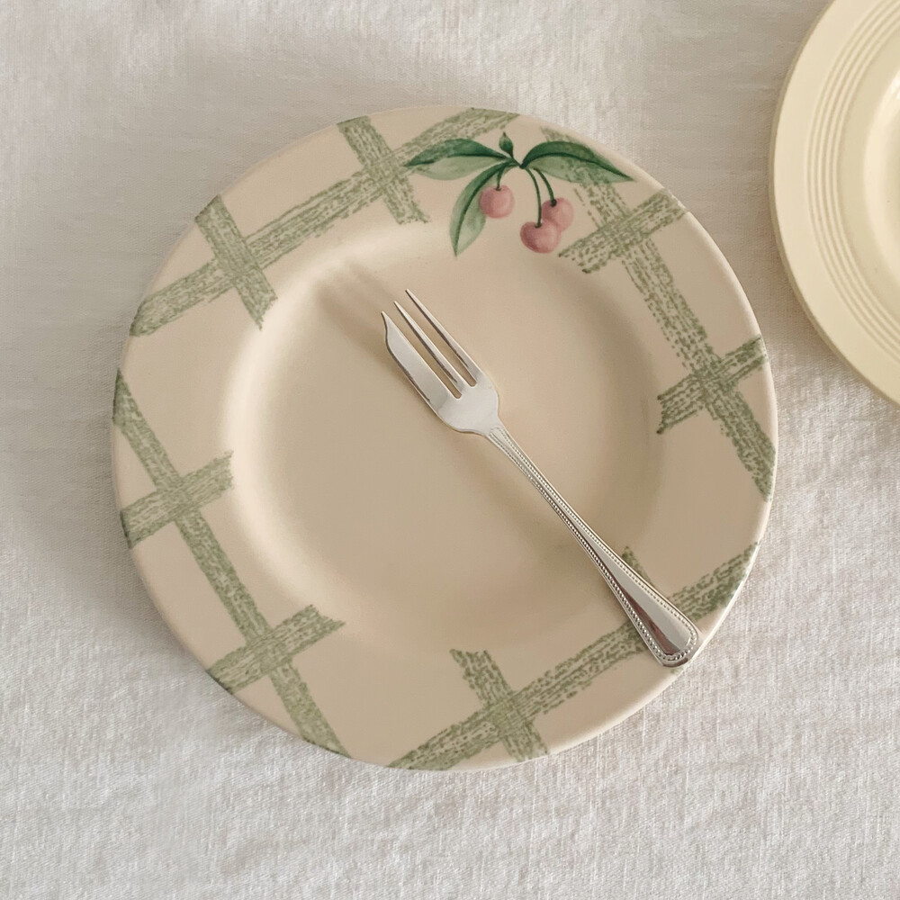 접시의 가장자리를 따라 둘러진 올리브색 체크패턴과 체리열매가