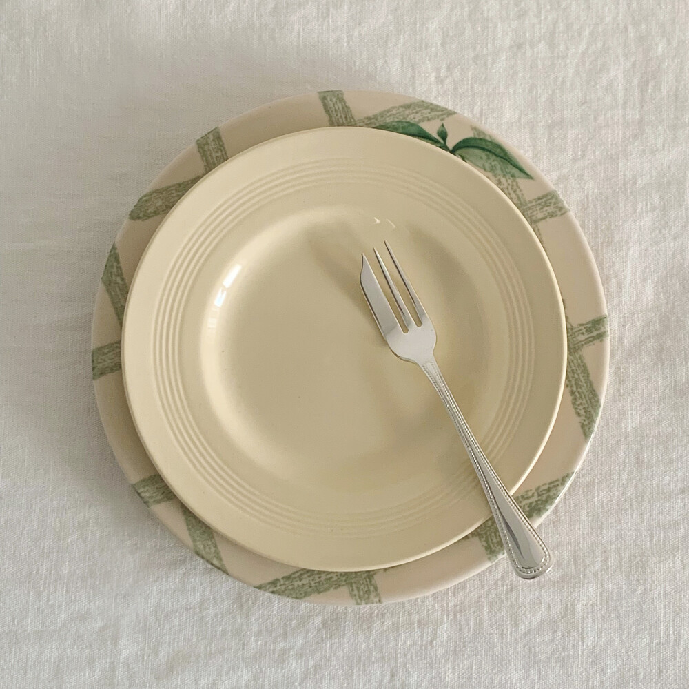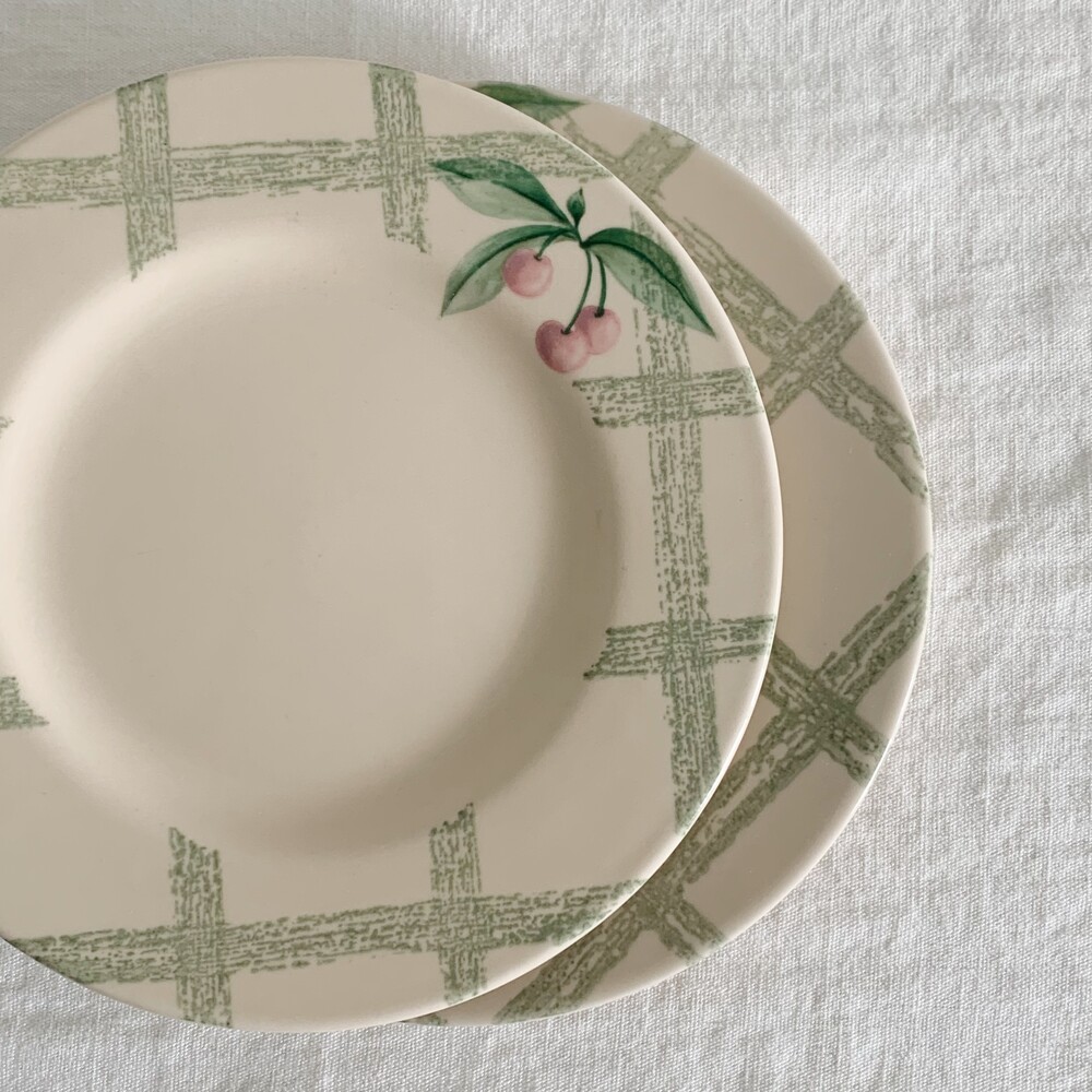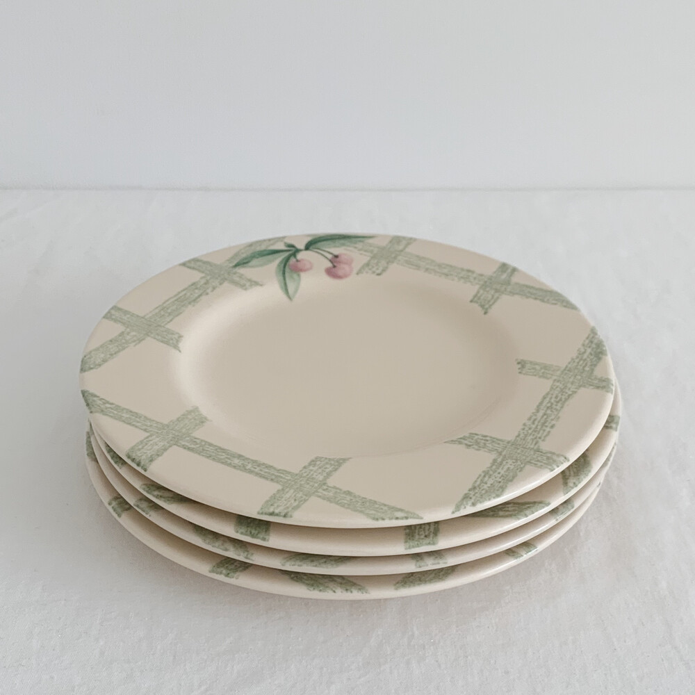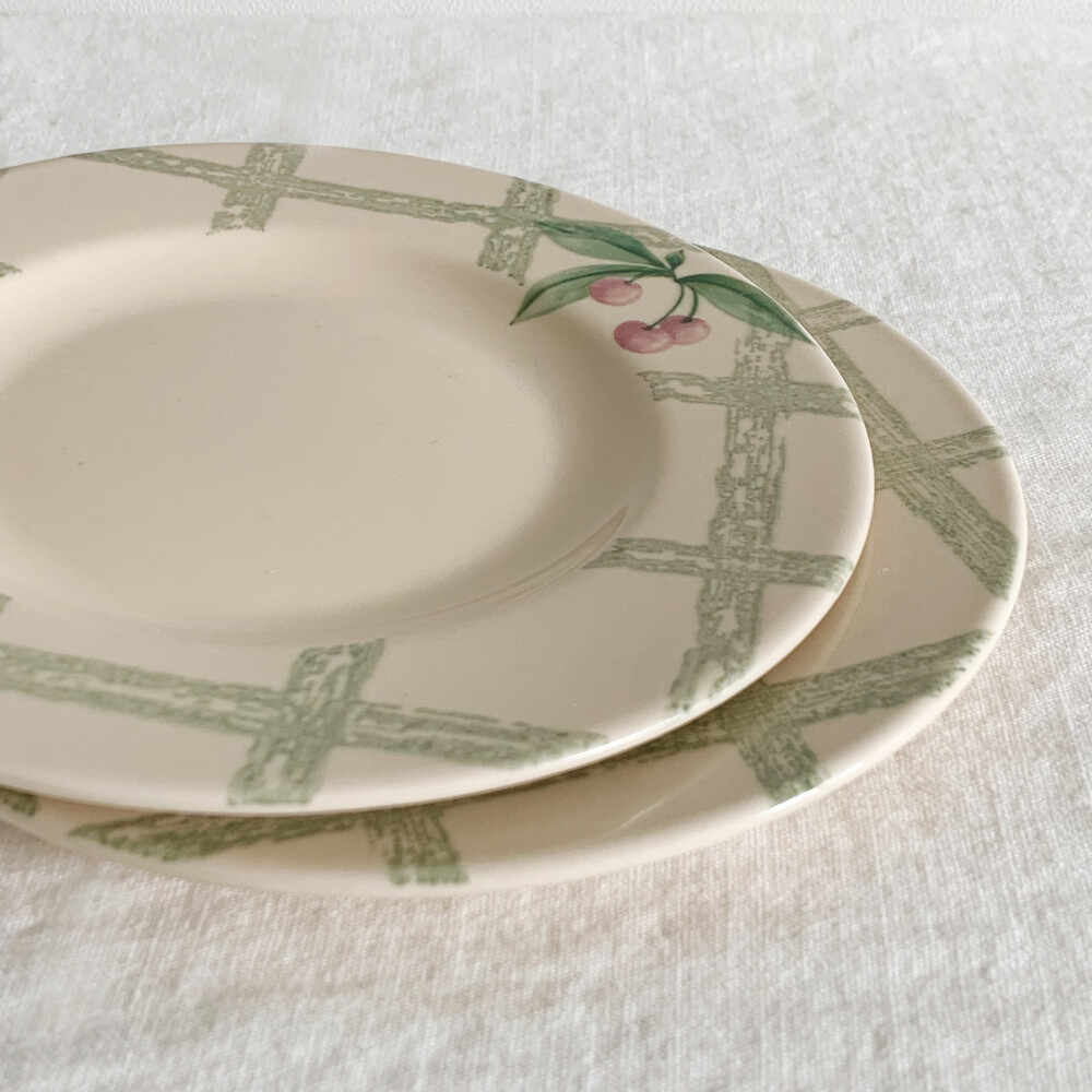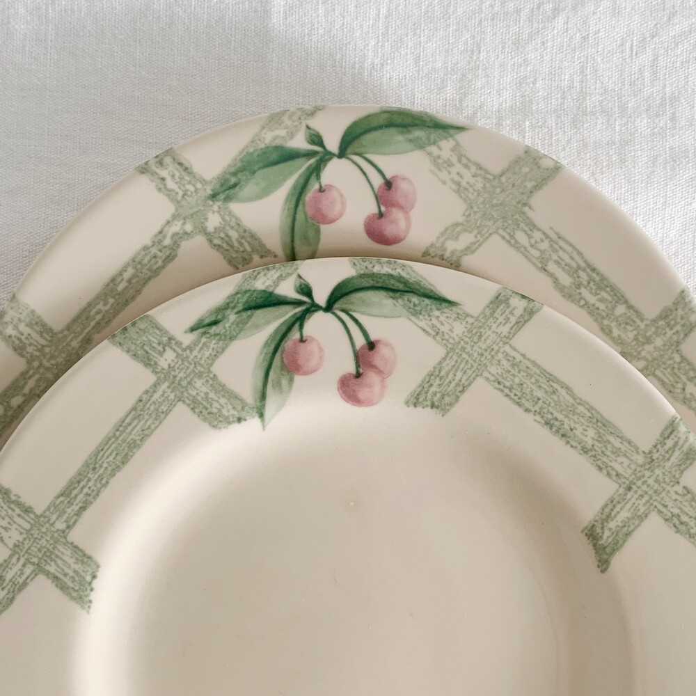접시의 가장자리를 따라 둘러진 올리브색 체크패턴과 체리열매가