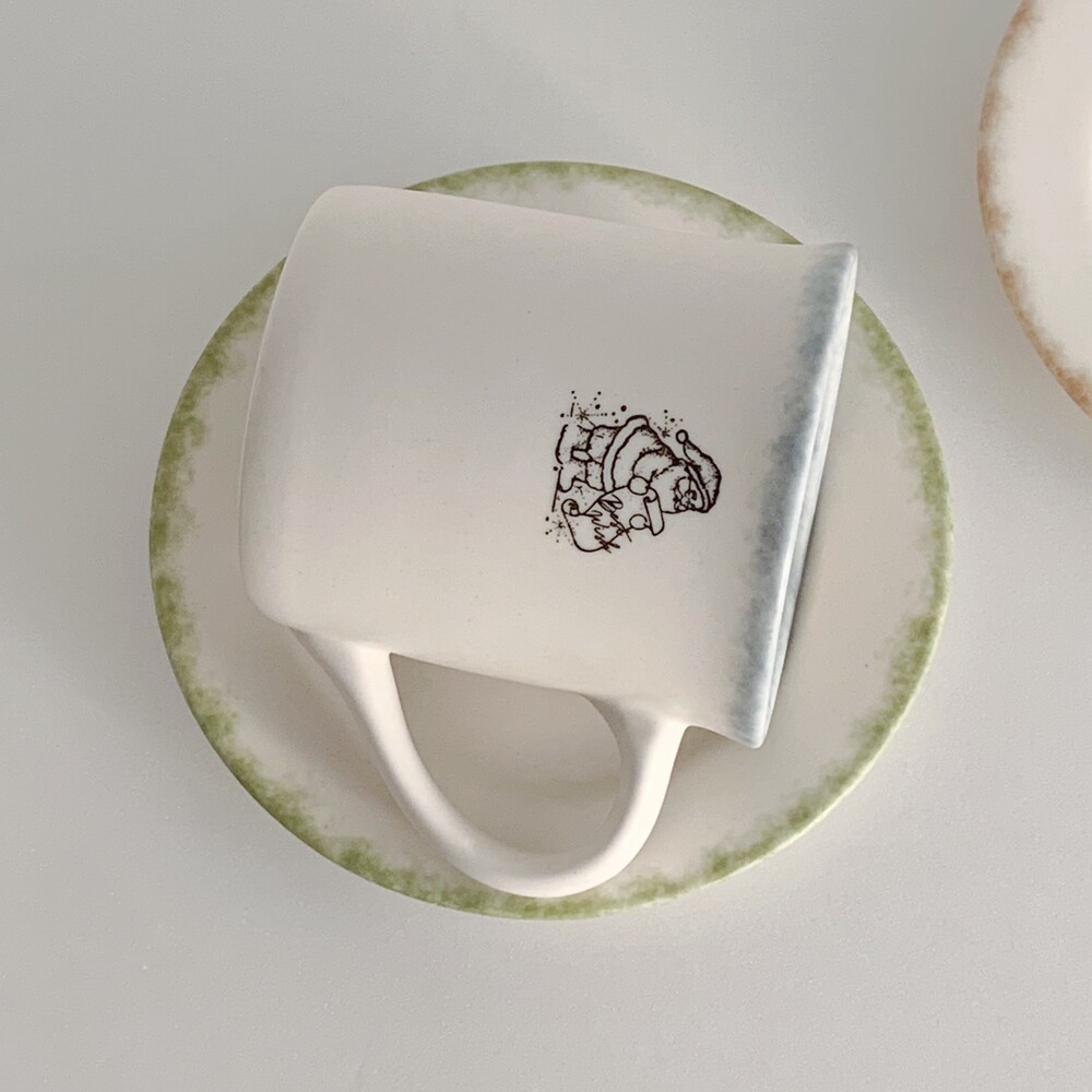 머그컵의 테두리에 입혀진 은은하고 옅은 올리브 그린 컬러와