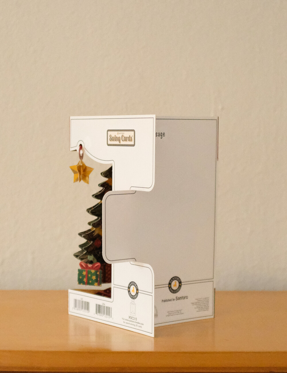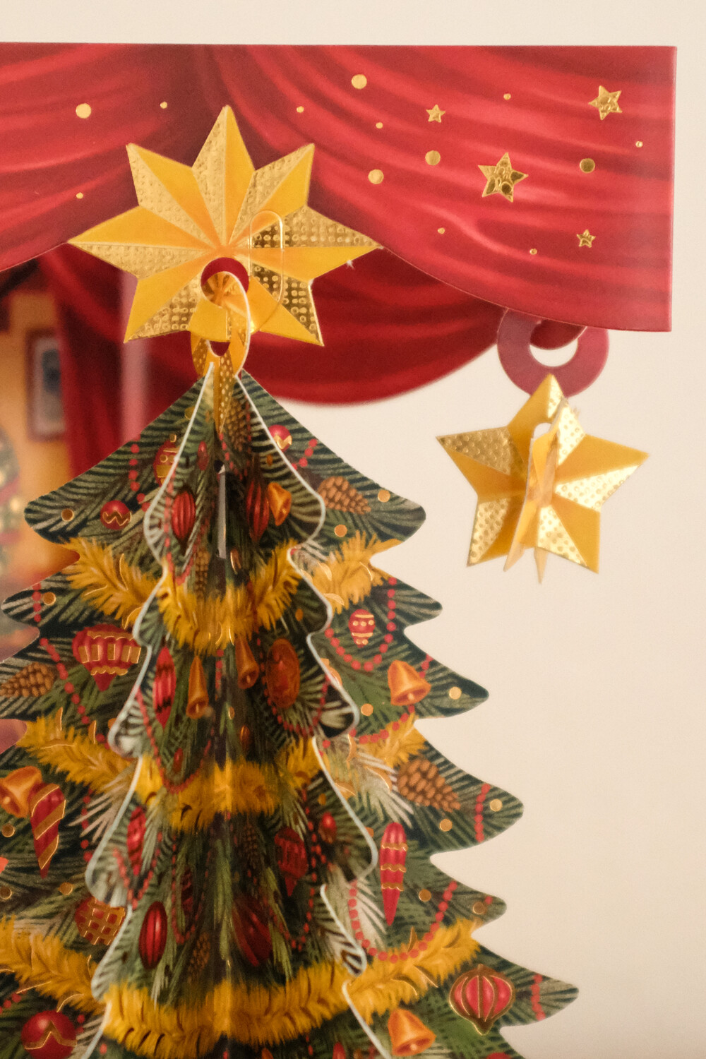 *카드의 공중에 매달린 트리와 별 오너먼트를 가볍게 건드리면
