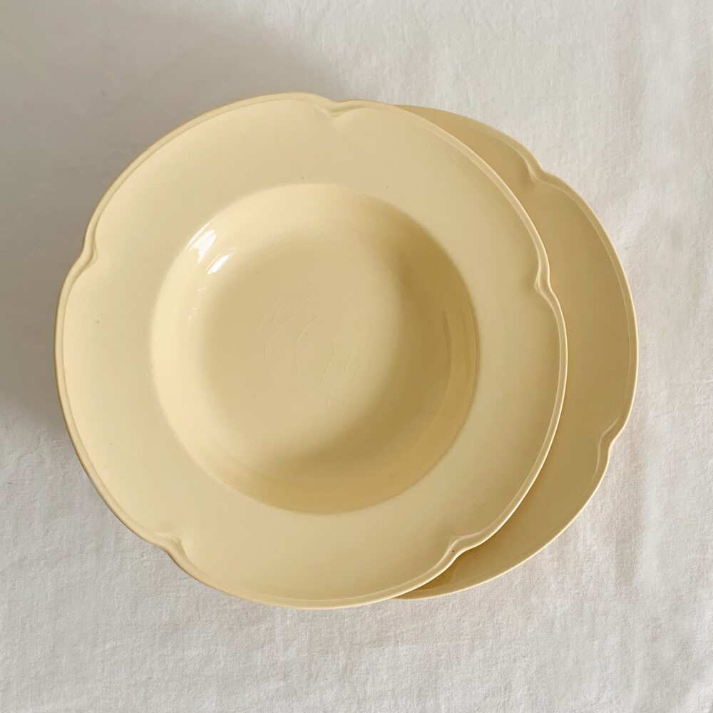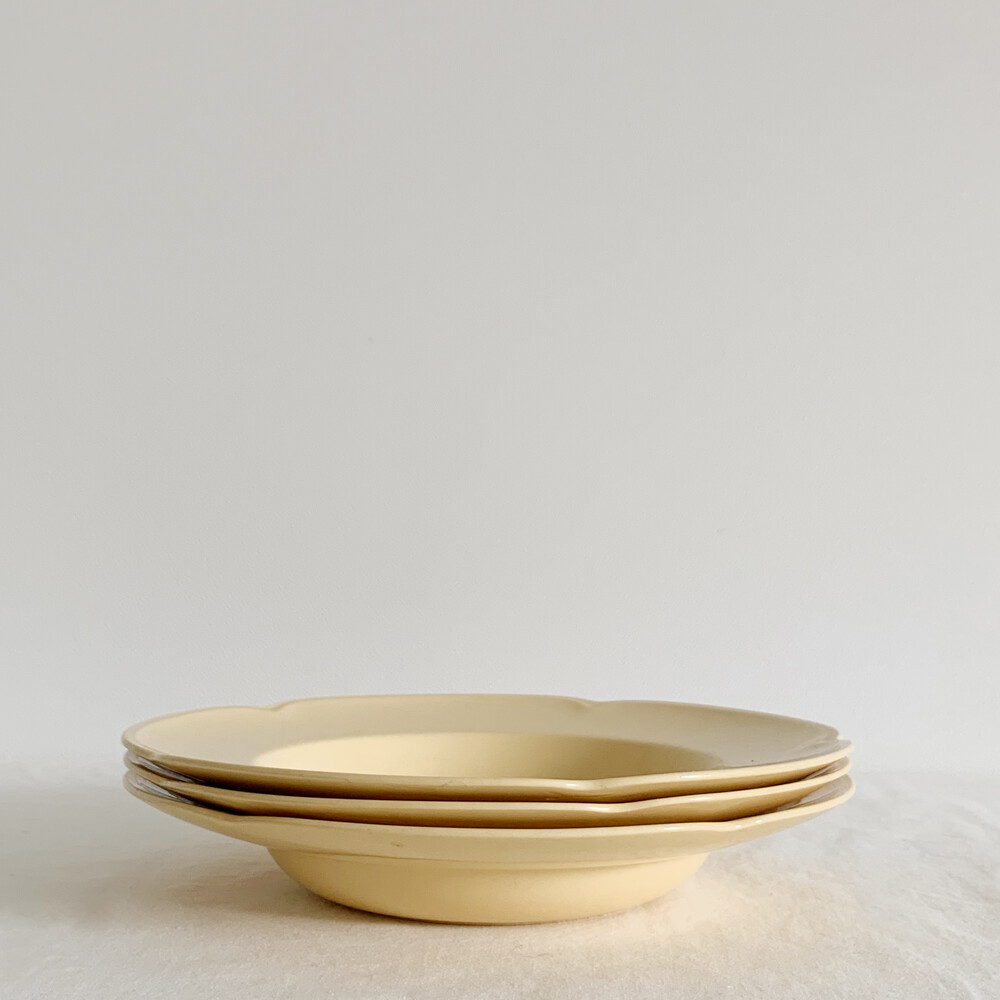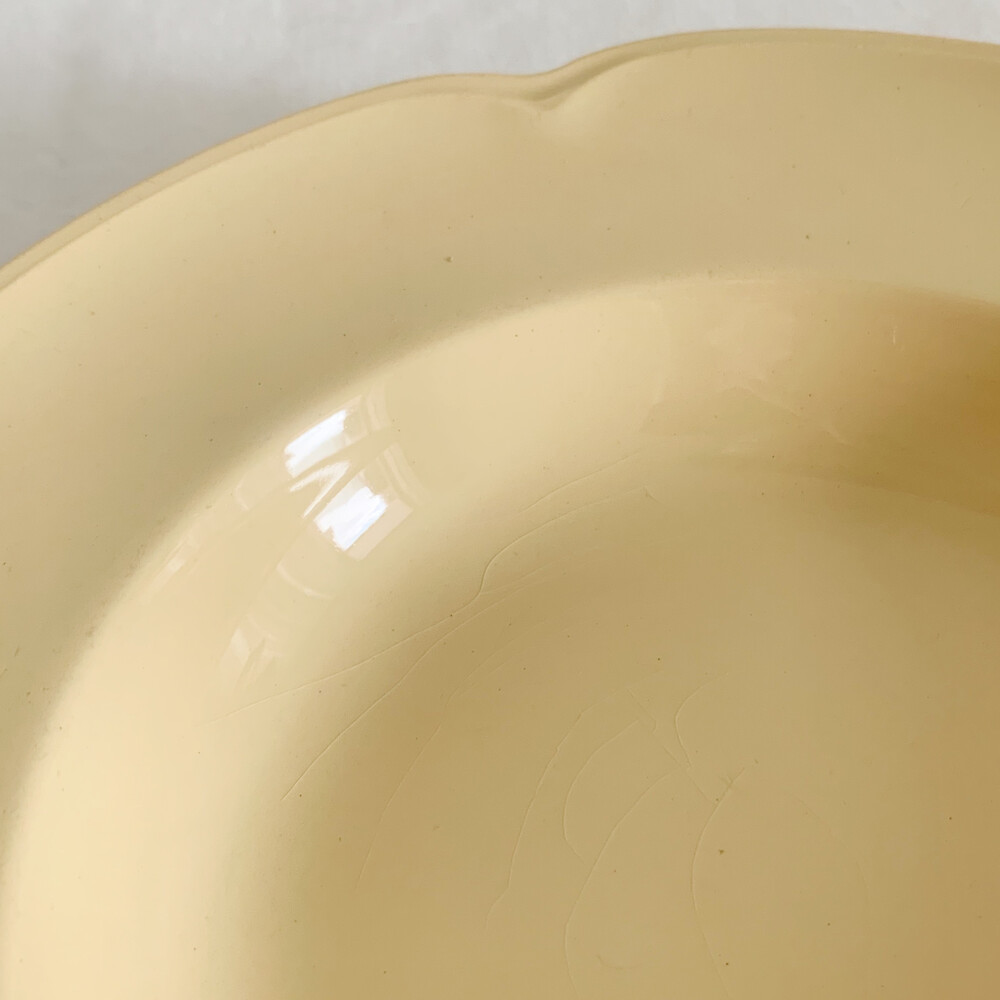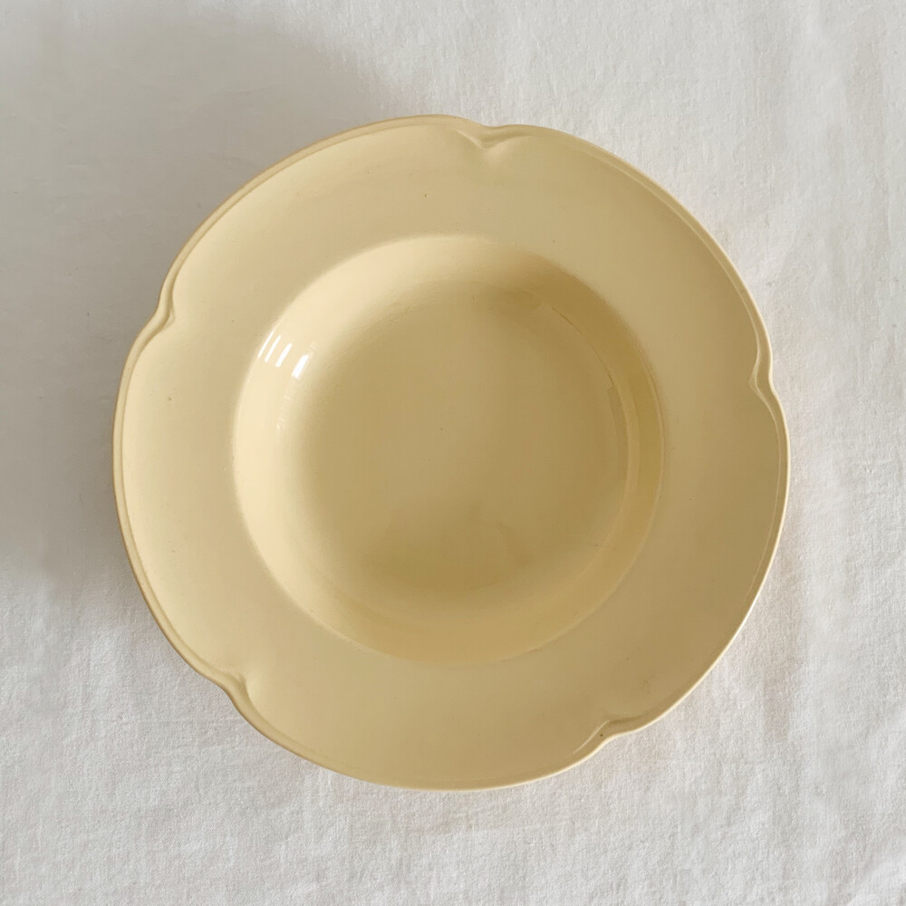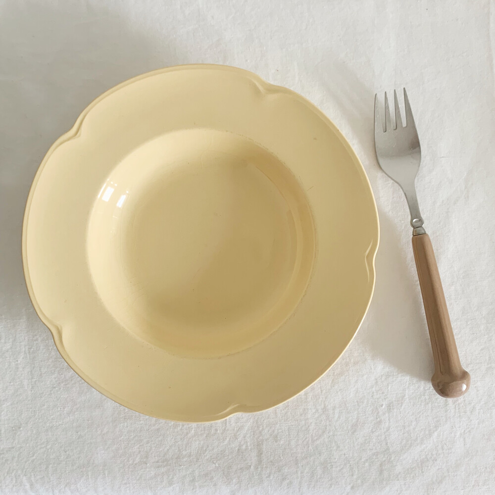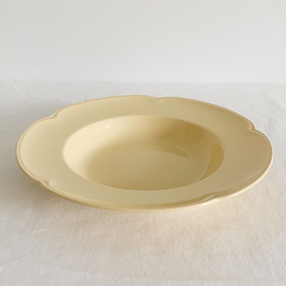 은은한 커스터드색의 접시로, 가장자리에 표현된