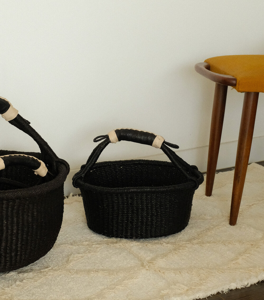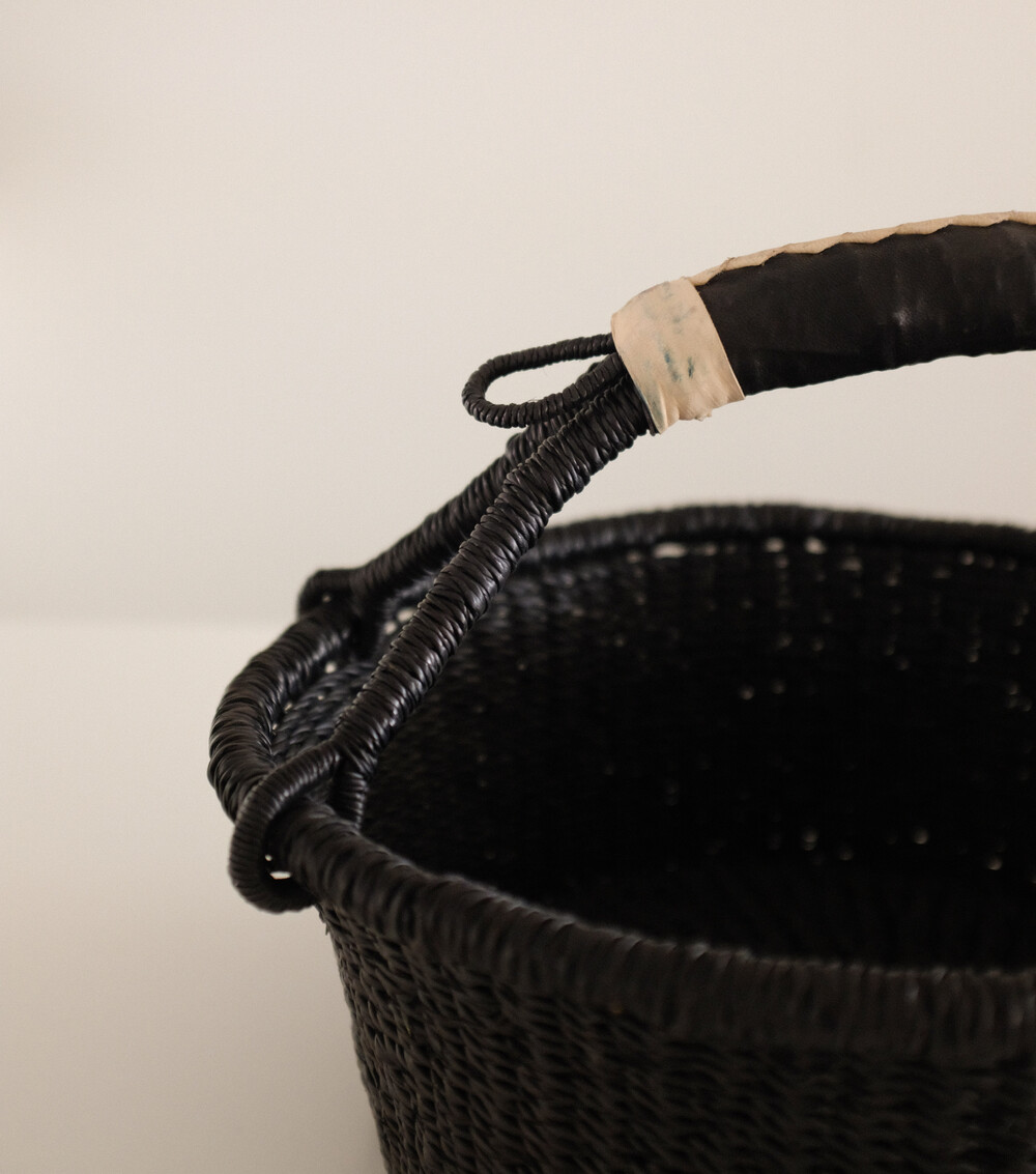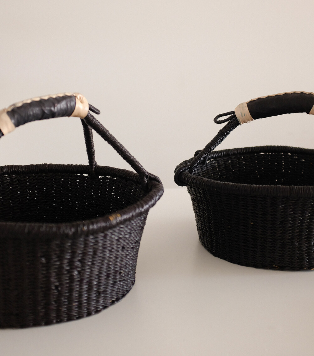 아프리카 가나의 북부지역인 볼가탕가지역에서 제작된 라운드 바스켓입니다. 가공되지 않은 자연의 재료인 가늘고 여린 코끼리 풀을 손으로 엮어 만들어진 바구니는, 만들어지는 모든 과정이