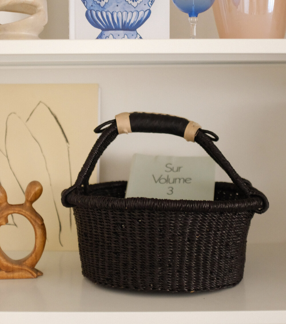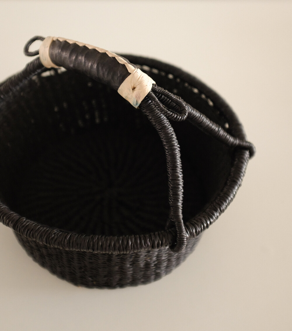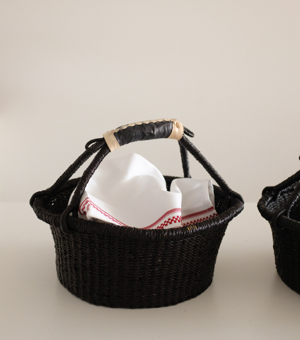 아프리카 가나의 북부지역인 볼가탕가지역에서 제작된 라운드 바스켓입니다. 가공되지 않은 자연의 재료인 가늘고 여린 코끼리 풀을 손으로 엮어 만들어진 바구니는, 만들어지는 모든 과정이
