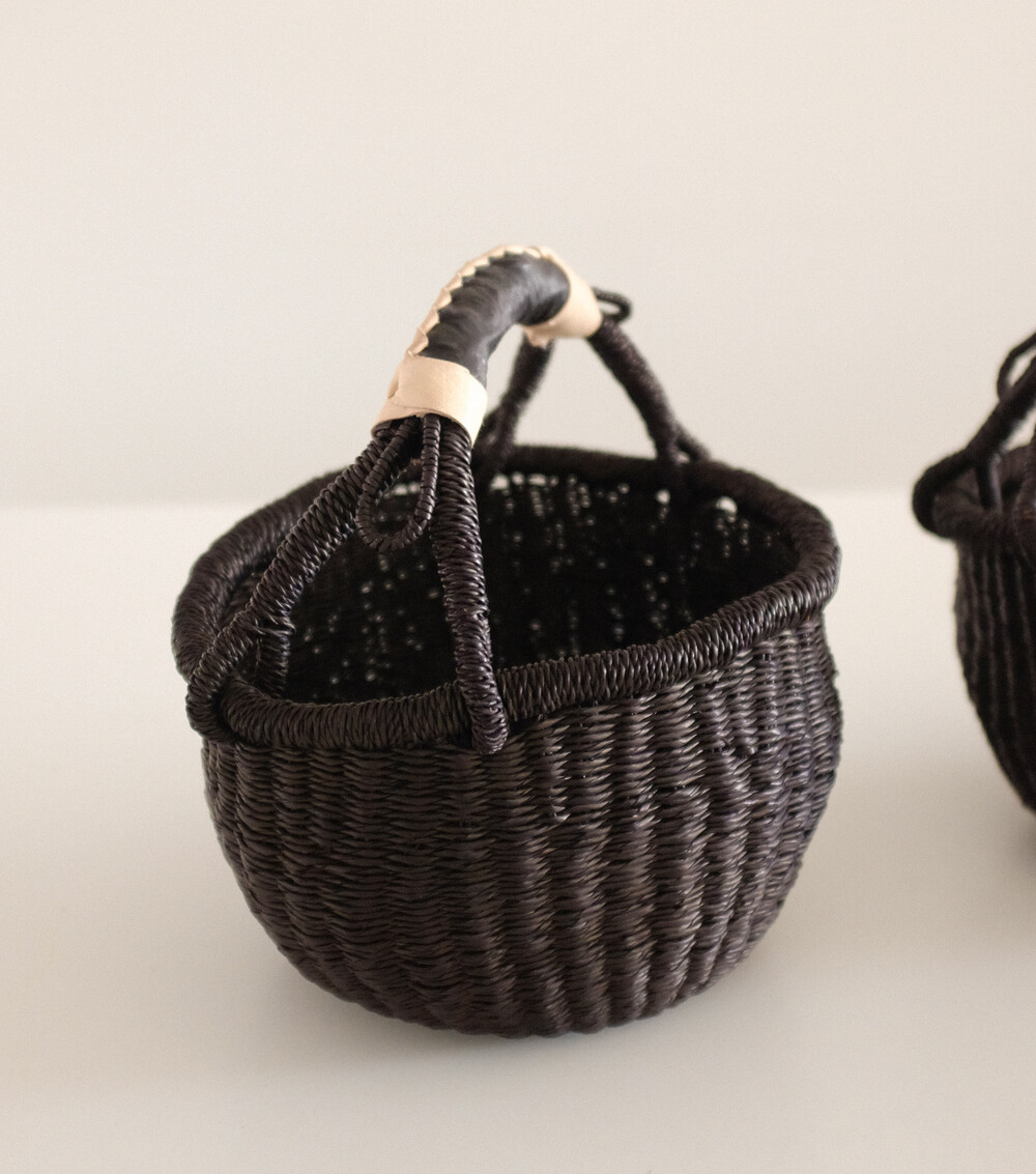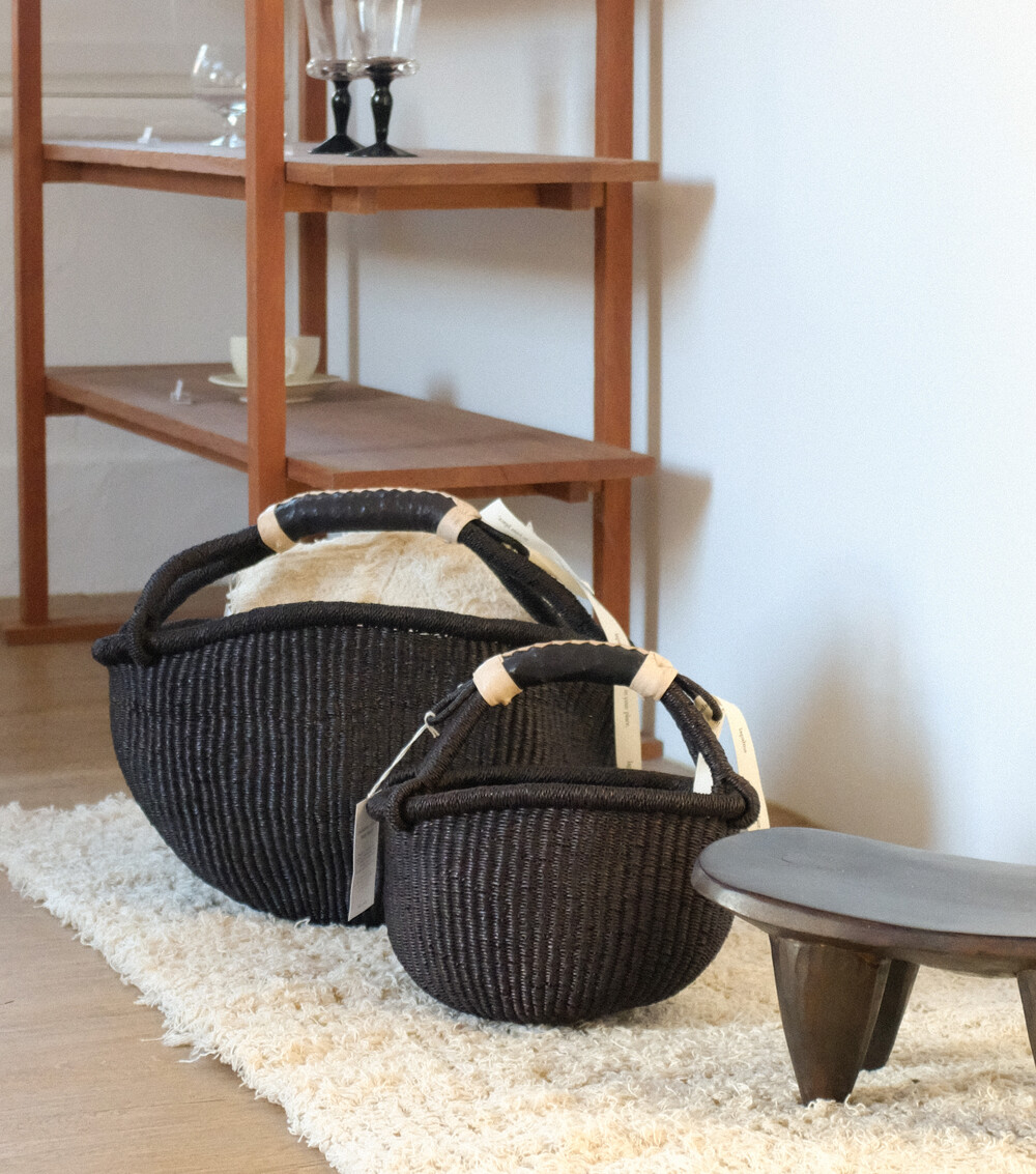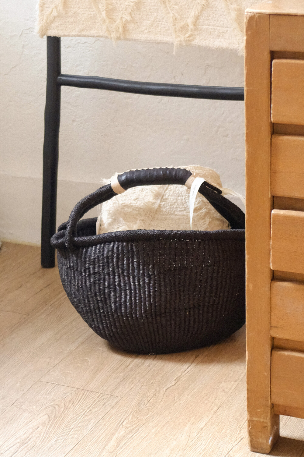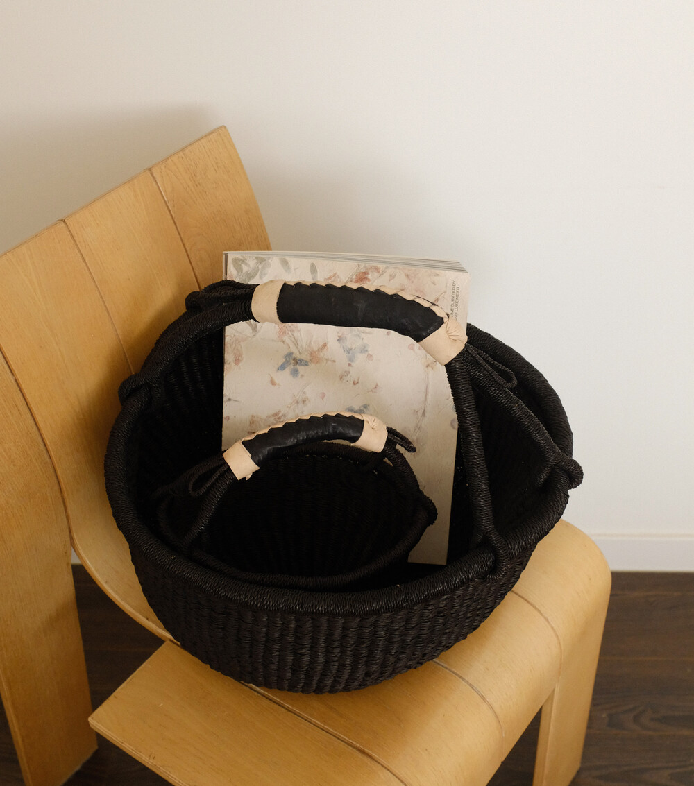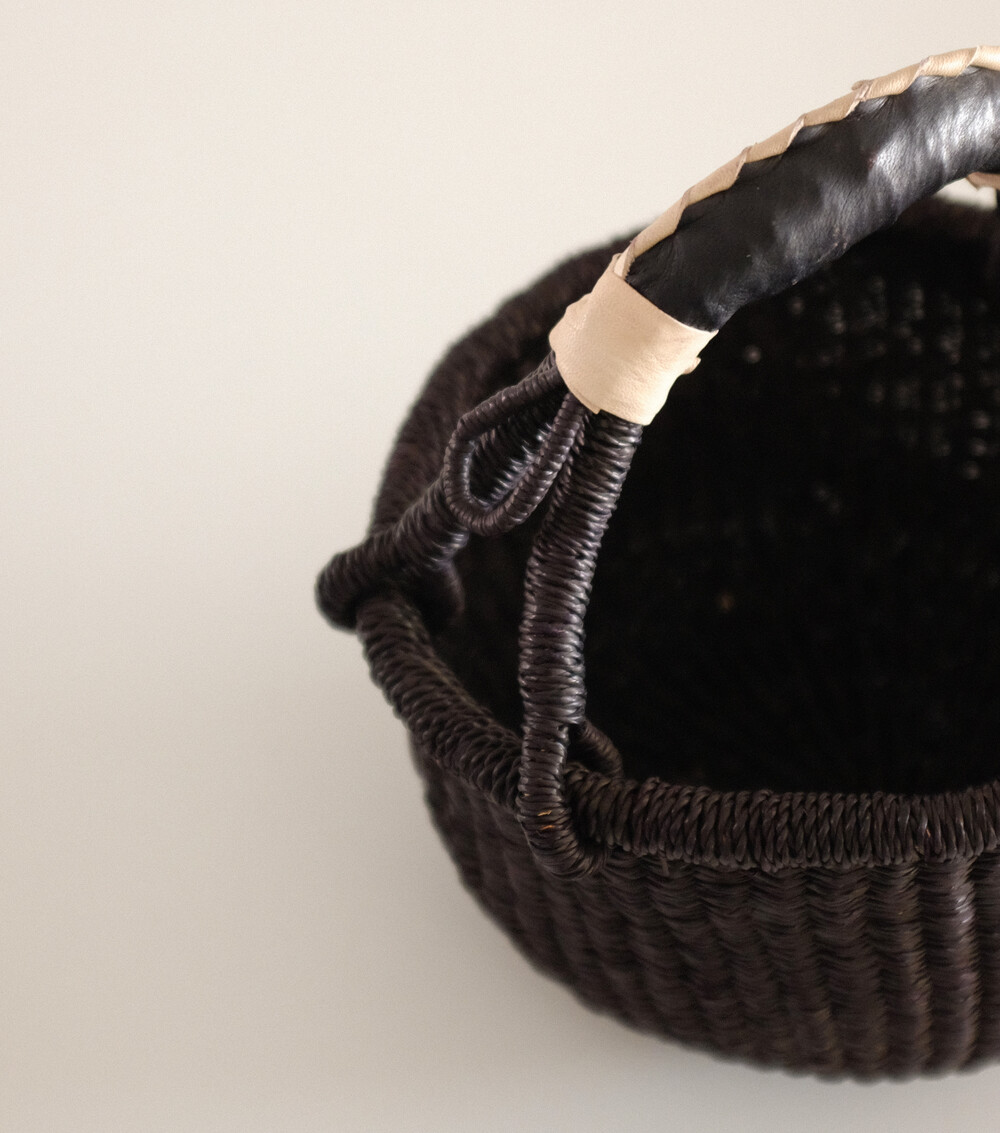 아프리카 가나의 북부지역인 볼가탕가지역에서 제작된 라운드 바스켓입니다. 가공되지 않은 자연의 재료인 가늘고 여린 코끼리 풀을 손으로 엮어 만들어진 바구니는, 만들어지는 모든 과정이