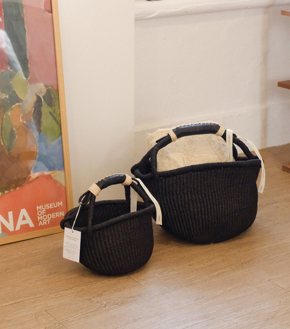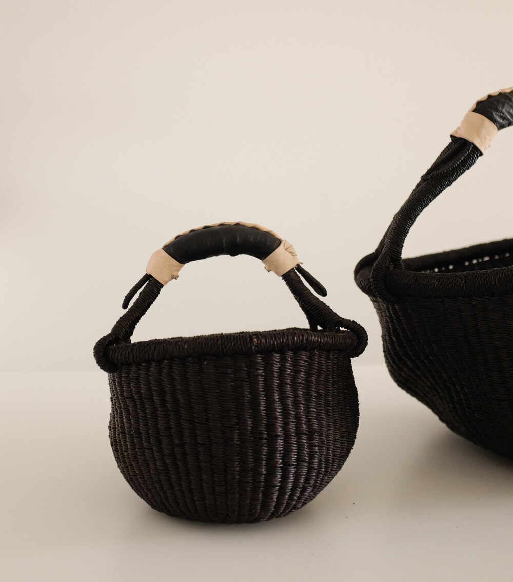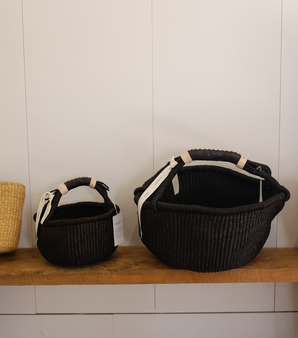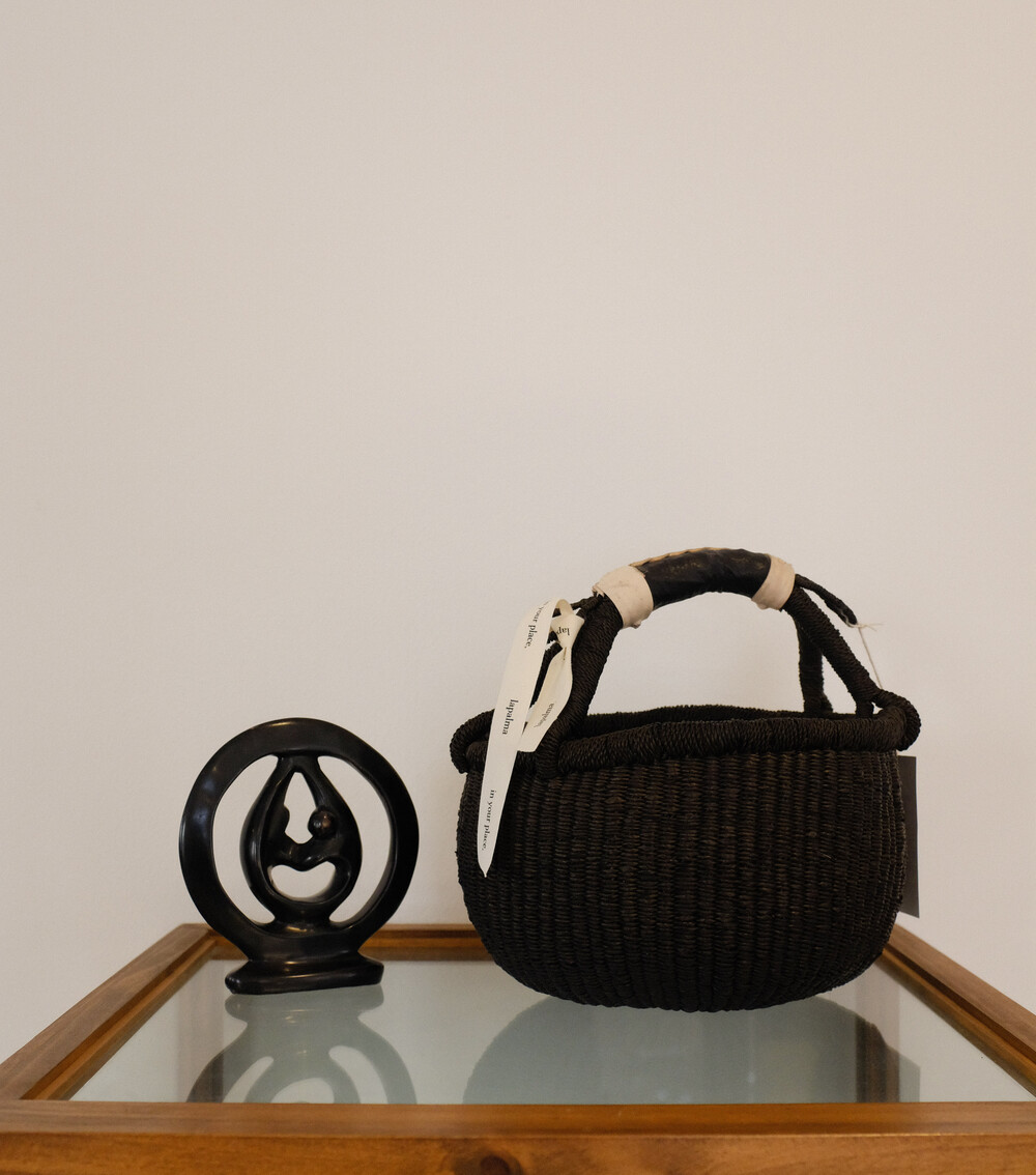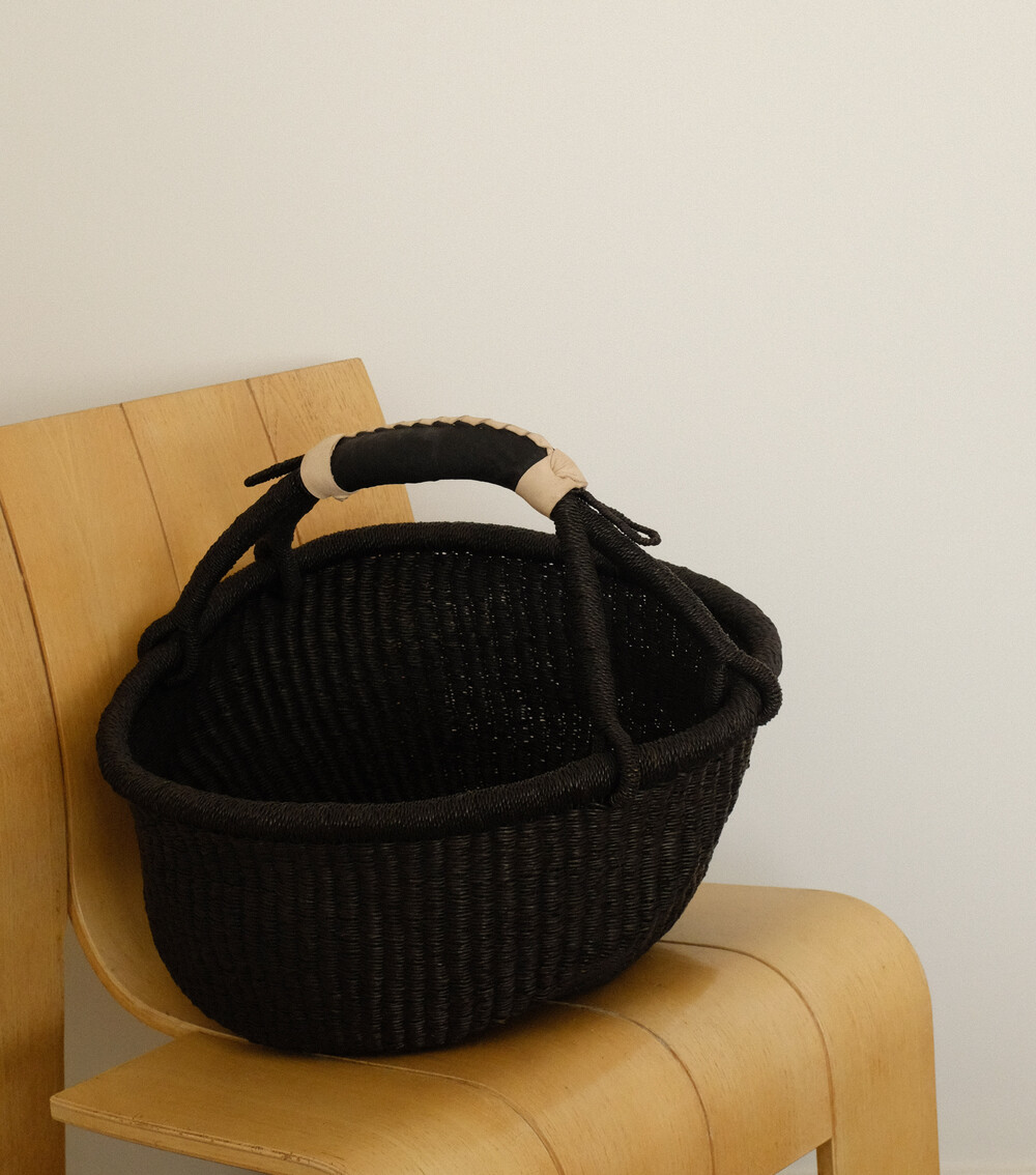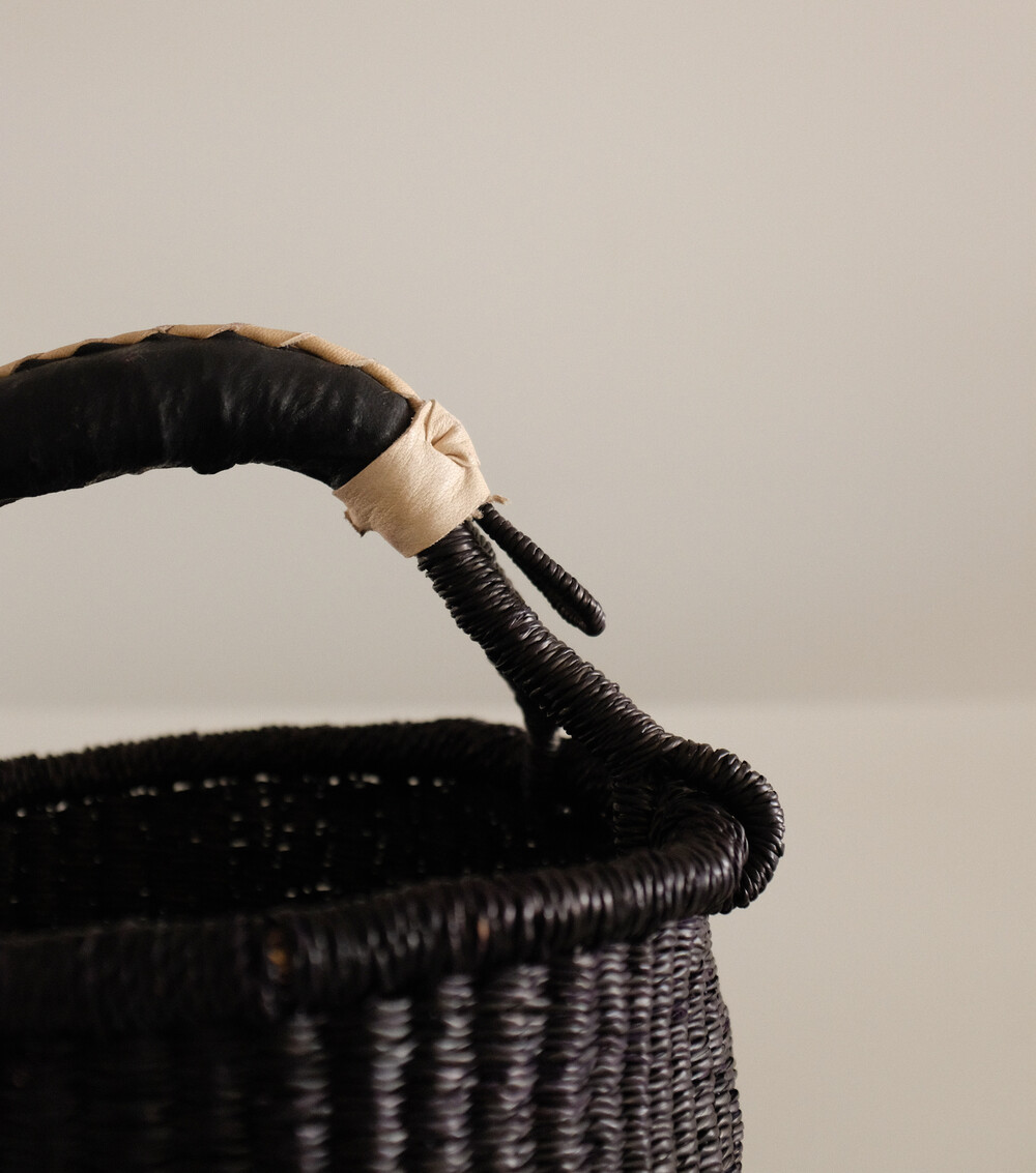 아프리카 가나의 북부지역인 볼가탕가지역에서 제작된 라운드 바스켓입니다. 가공되지 않은 자연의 재료인 가늘고 여린 코끼리 풀을 손으로 엮어 만들어진 바구니는, 만들어지는 모든 과정이