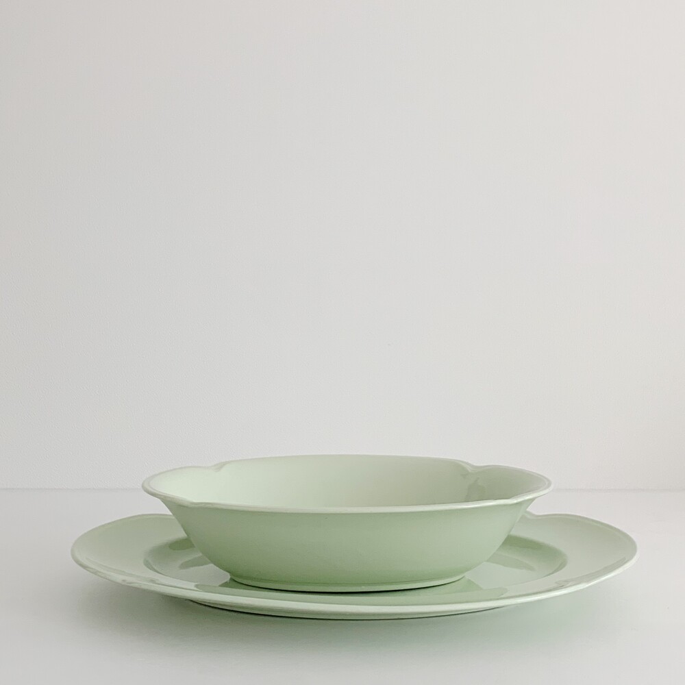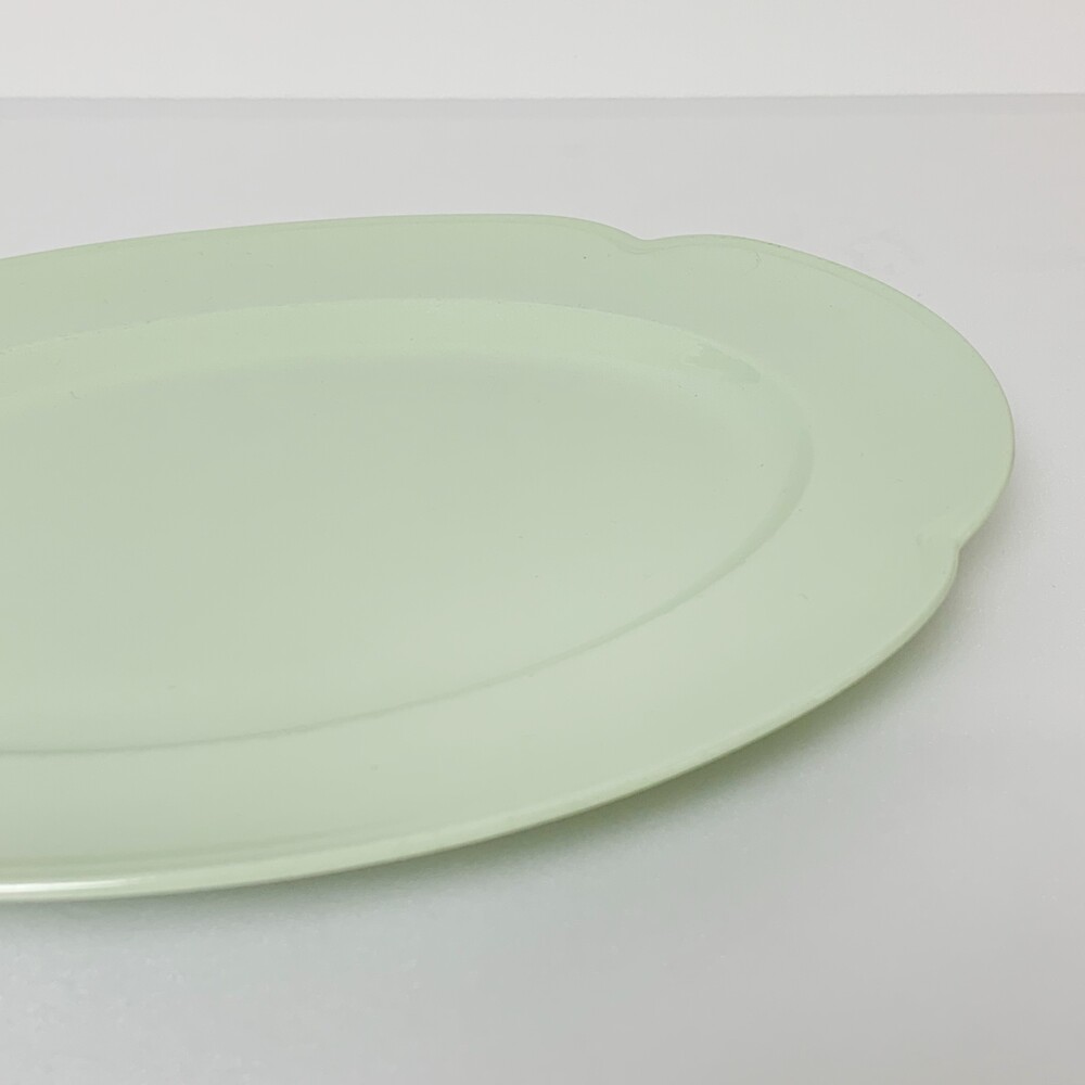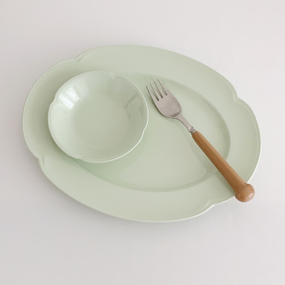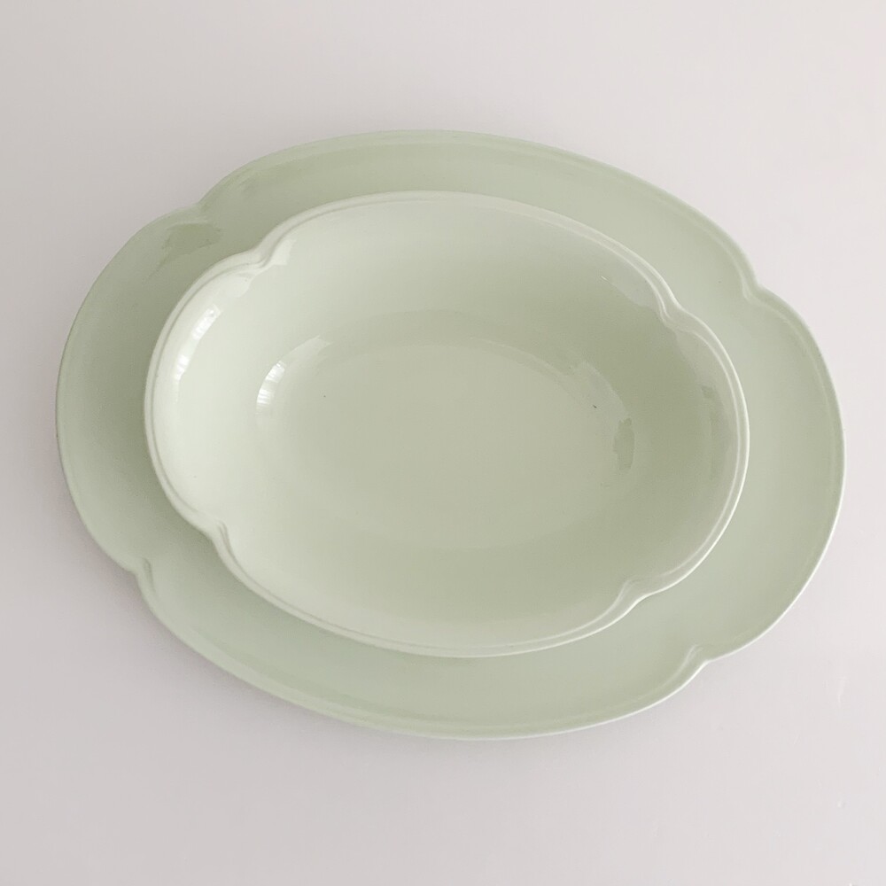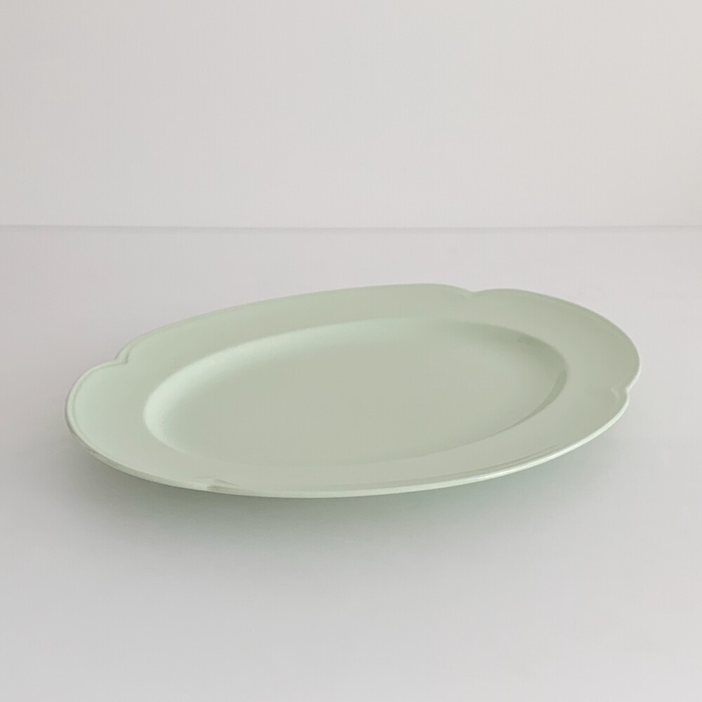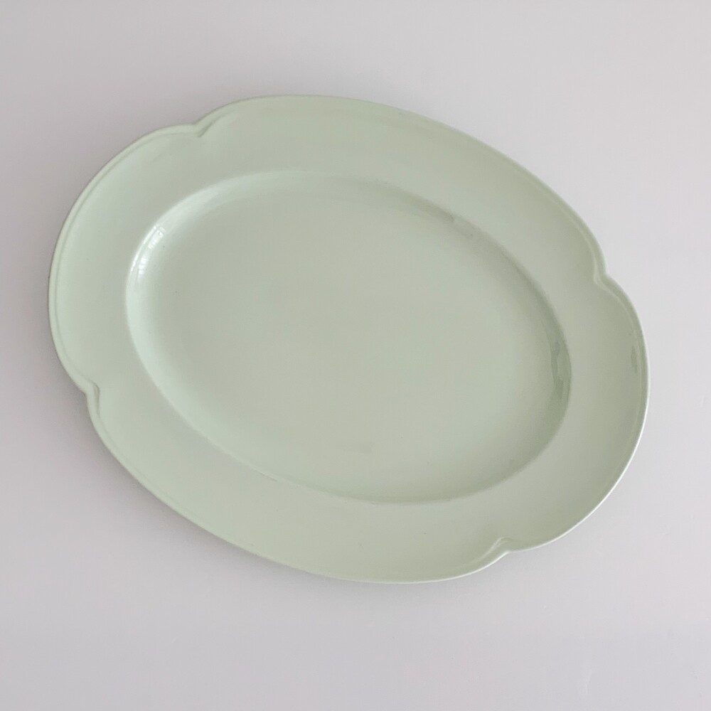 옅은 올리브그린색을 띄는 넉넉한 사이즈의 오발 접시로,