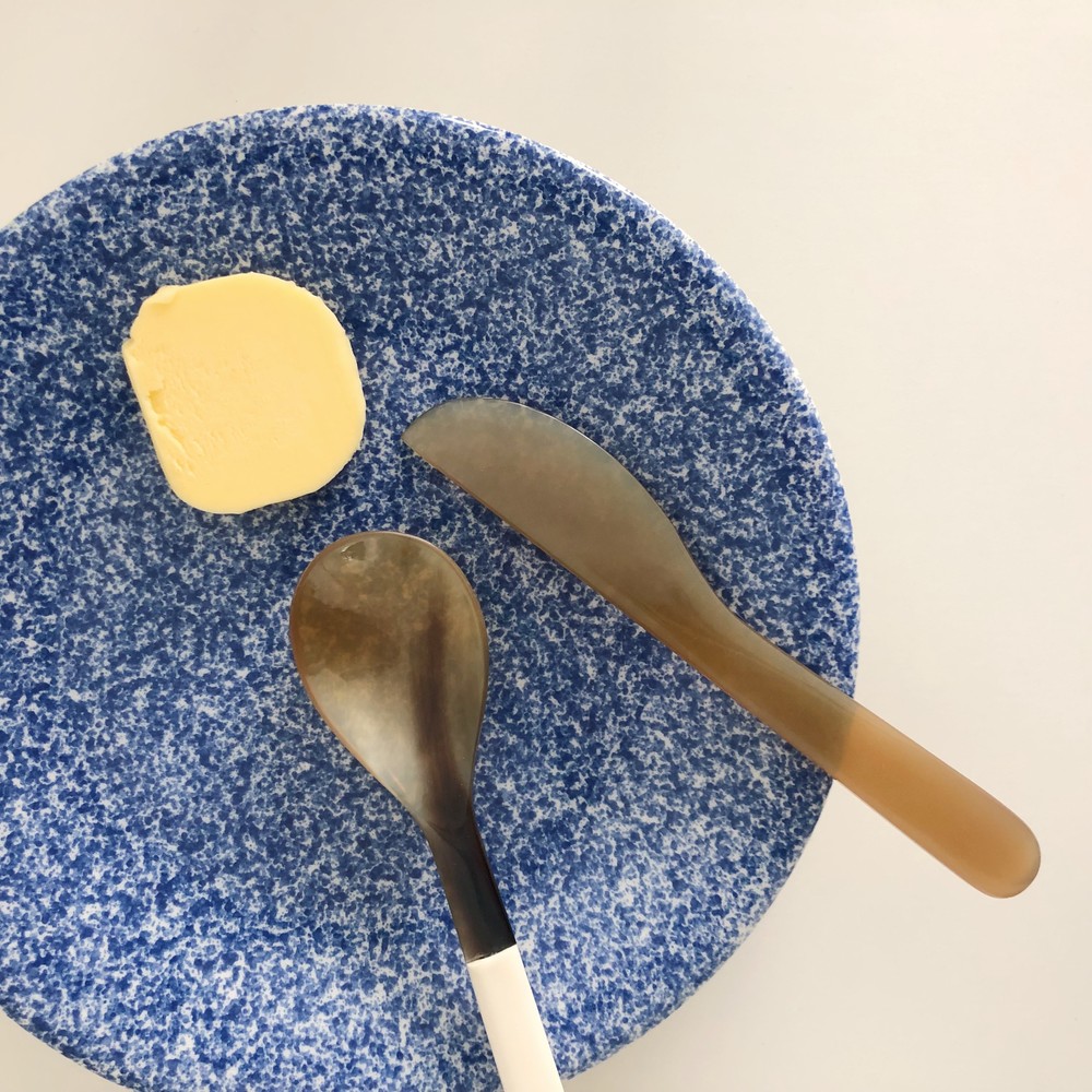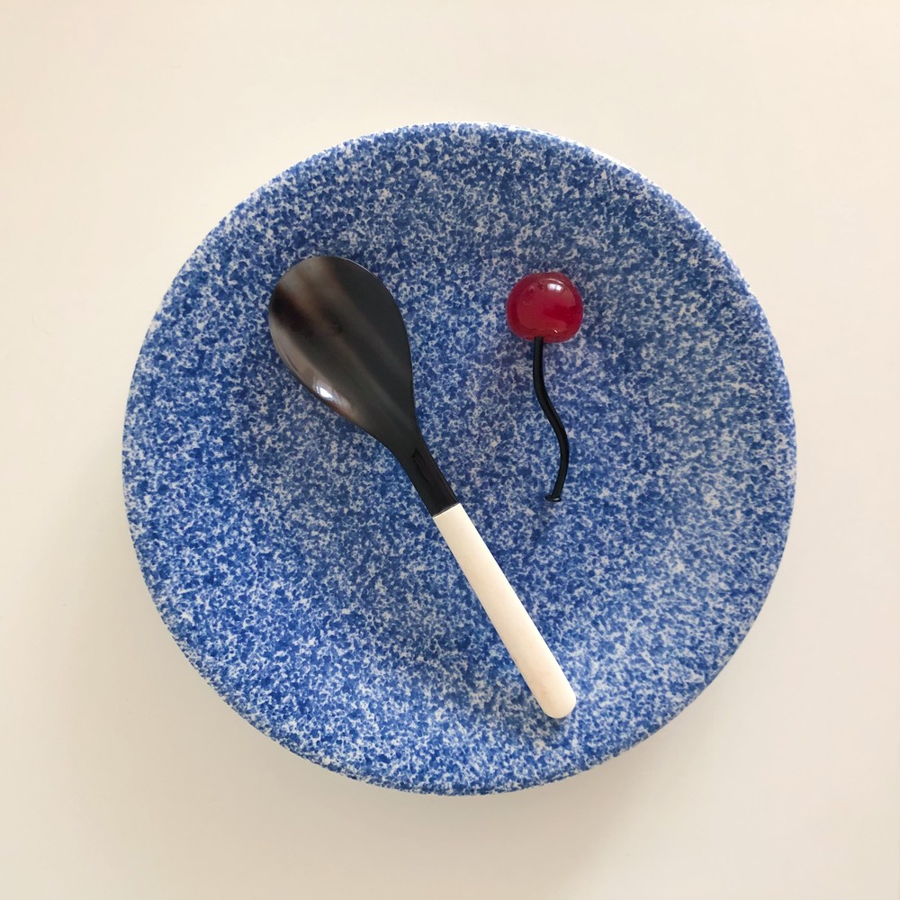 푸른색의 작은 점이 불규칙적으로 흩어져 단순하지만 테이블에 생동감을