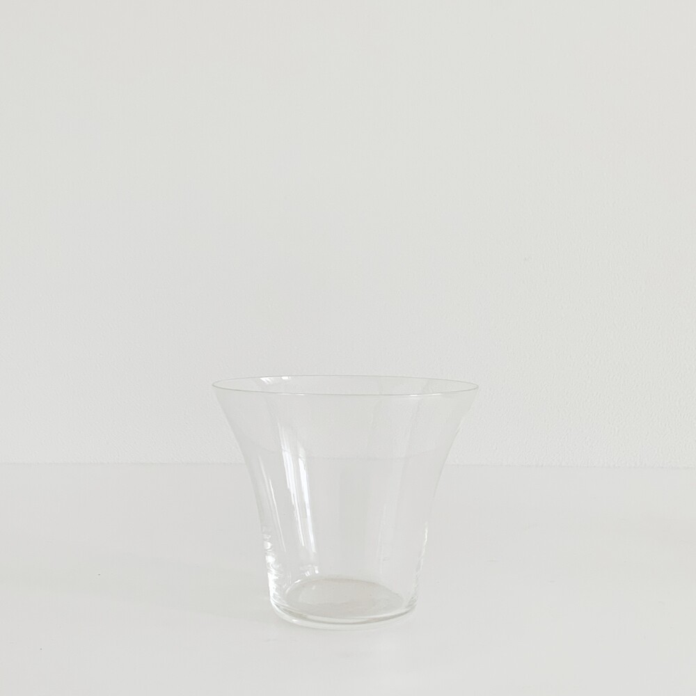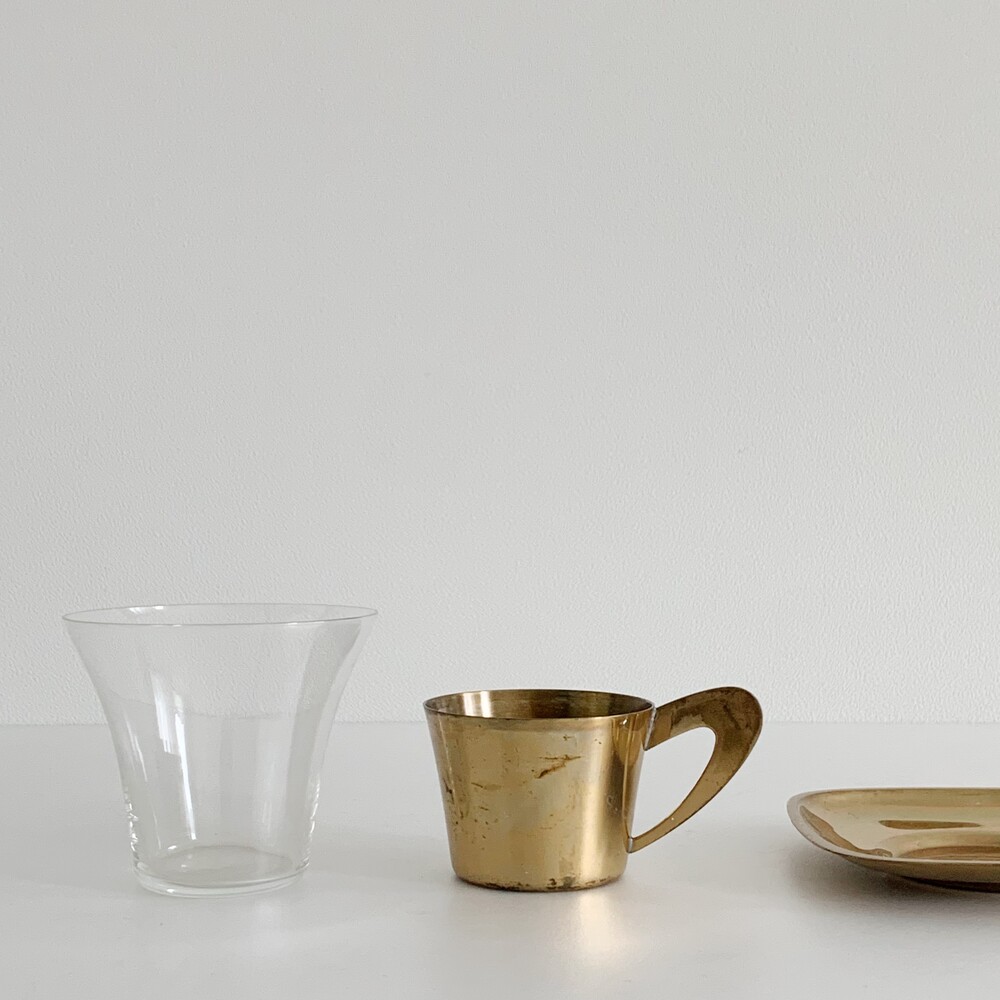 종모양의 얇은 두께를 가진 유리컵과 적당한 광택감이 도는 브라소 소재의