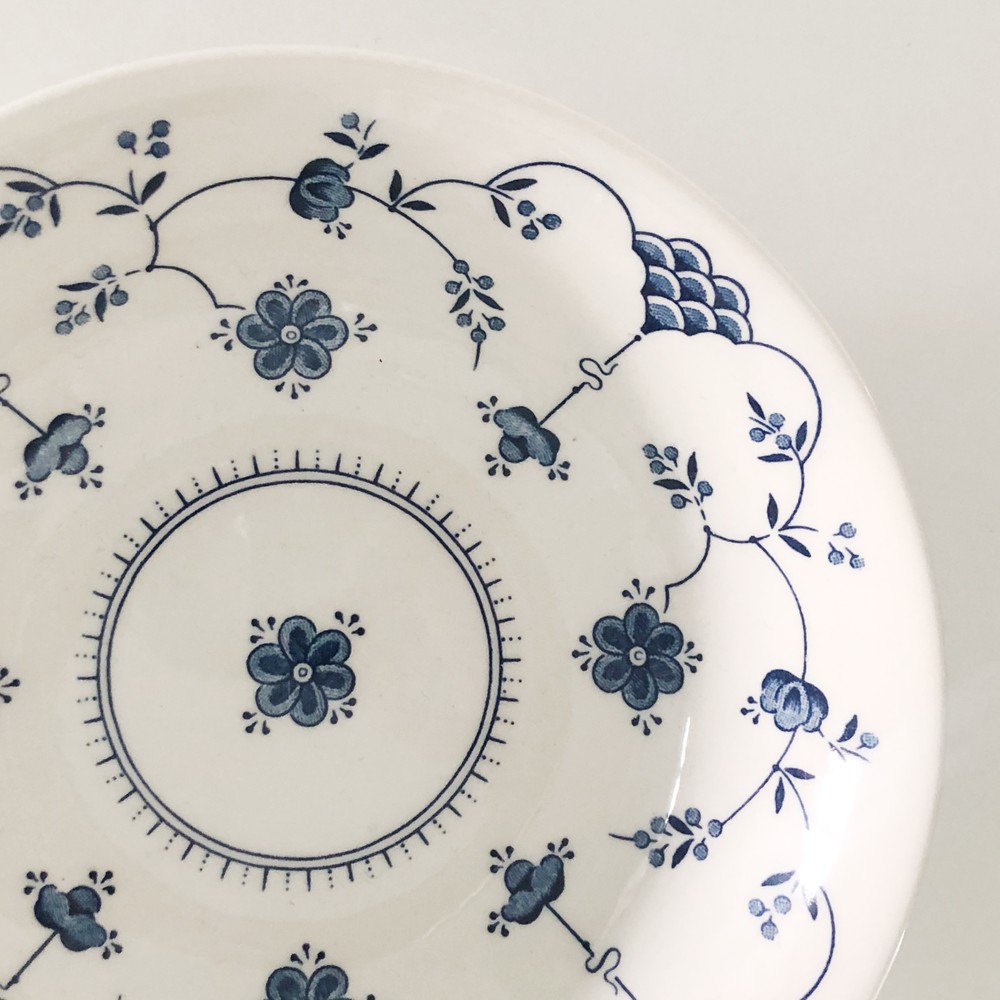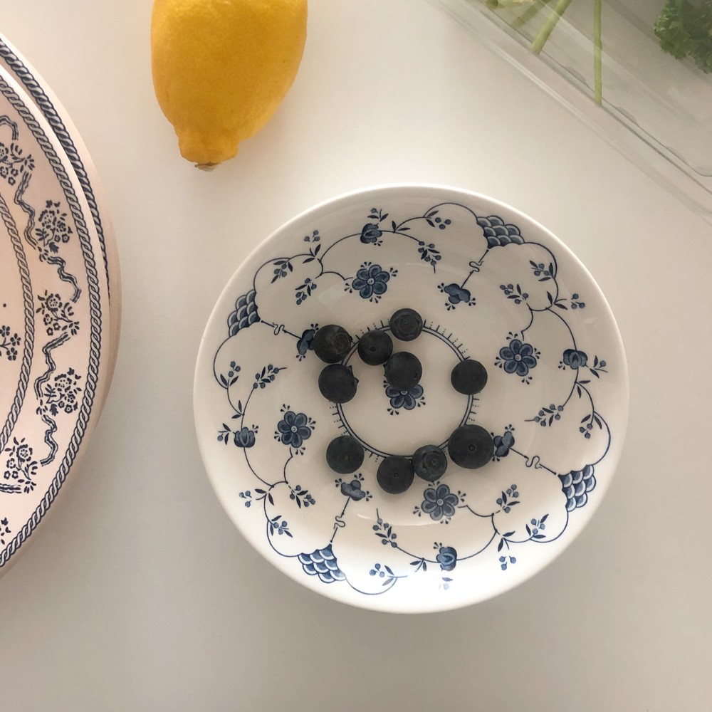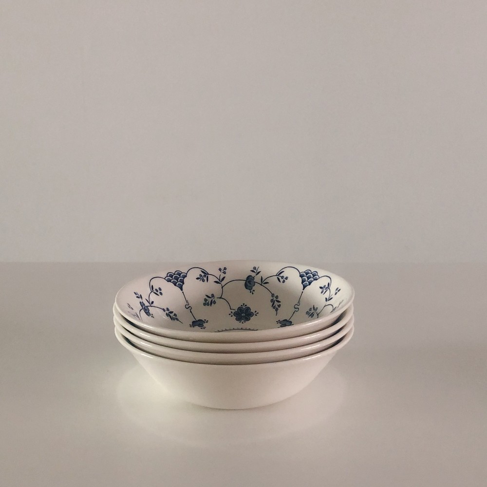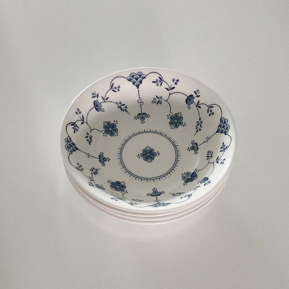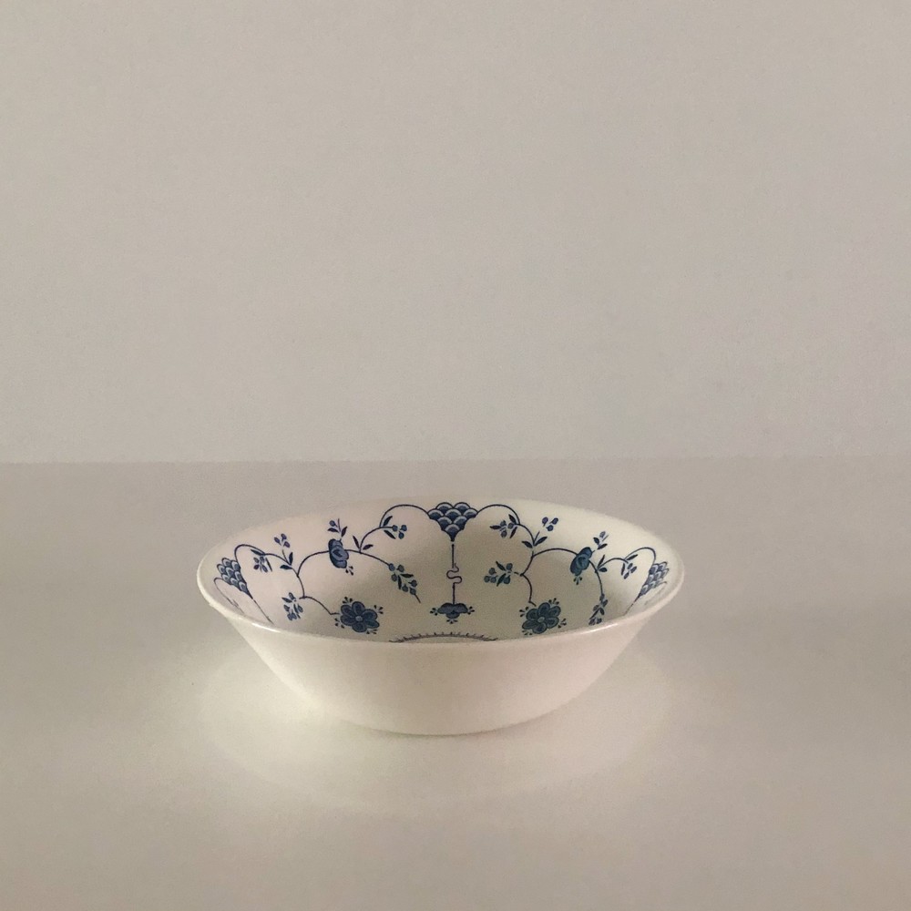 영국의 전통적인 도자기 회사인 처칠에서 생산된 보울입니다. 내구성이 강한 세라믹 소재와 선명하고 짙은 블루에 군더더기없이 깨끗한 하얀색의 대비가 돋보이는 보울로, 덴마크 회사인 로얄 코펜하겐에서 초창기에 많이 보여진 후 오랫동안 인기 있는 블루 플루티드 패턴으로