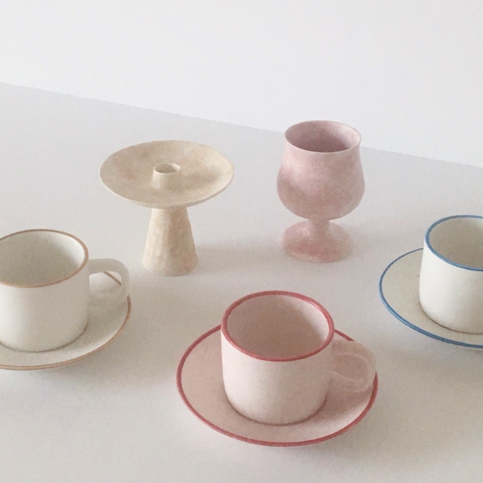 커피잔과 소서를 이루는 단단한 도자기 소재는 직접 석고를 반죽한 후