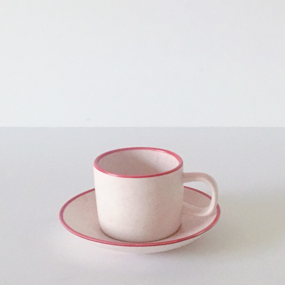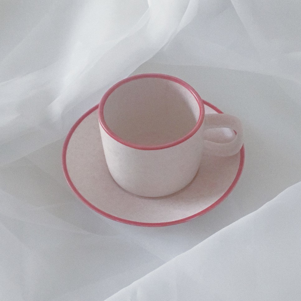 커피잔과 소서의 둥근 모양을 따라 짙은 분홍빛의 띠를 두르는 것으로