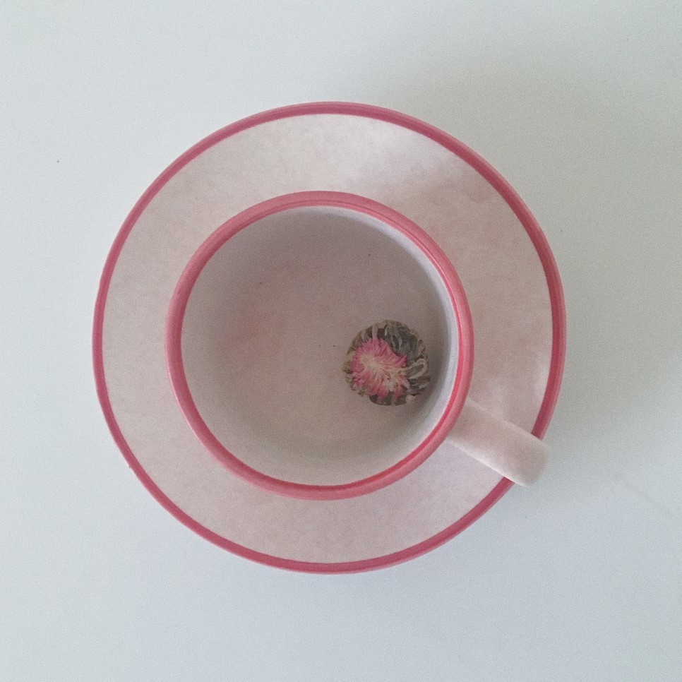 커피잔과 받침은, 안개가 낀듯 뿌옇고 옅은 분홍빛의 불규칙적이고