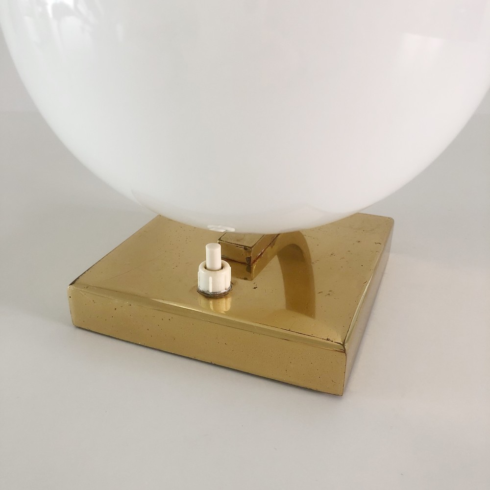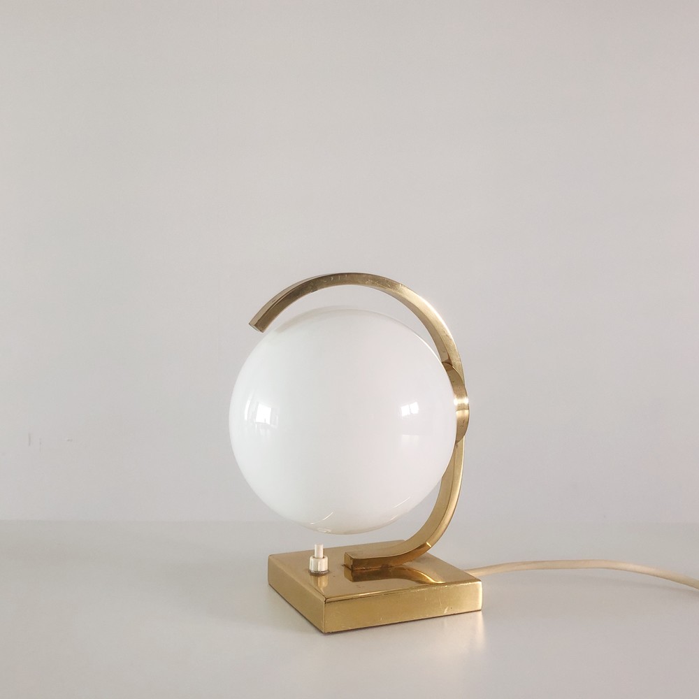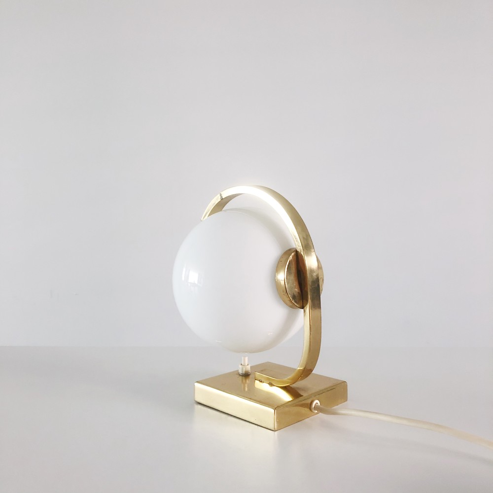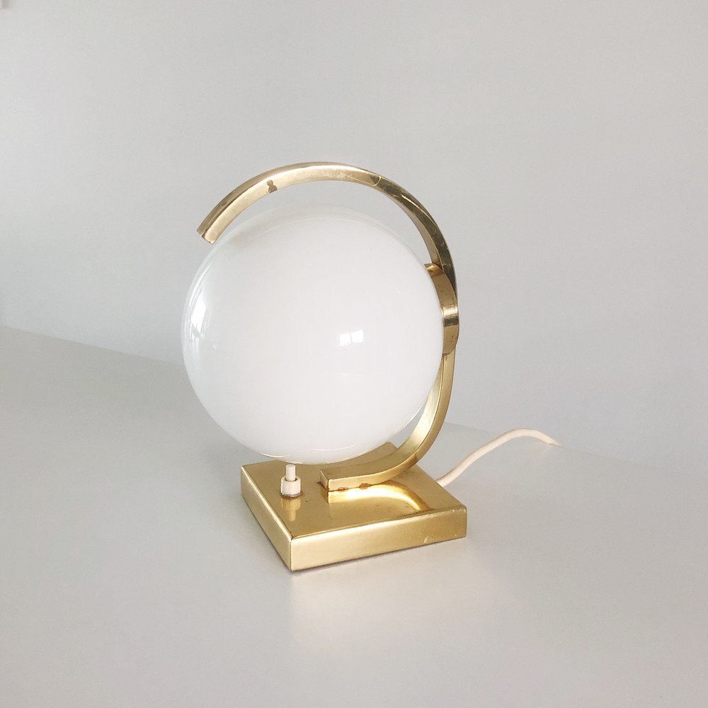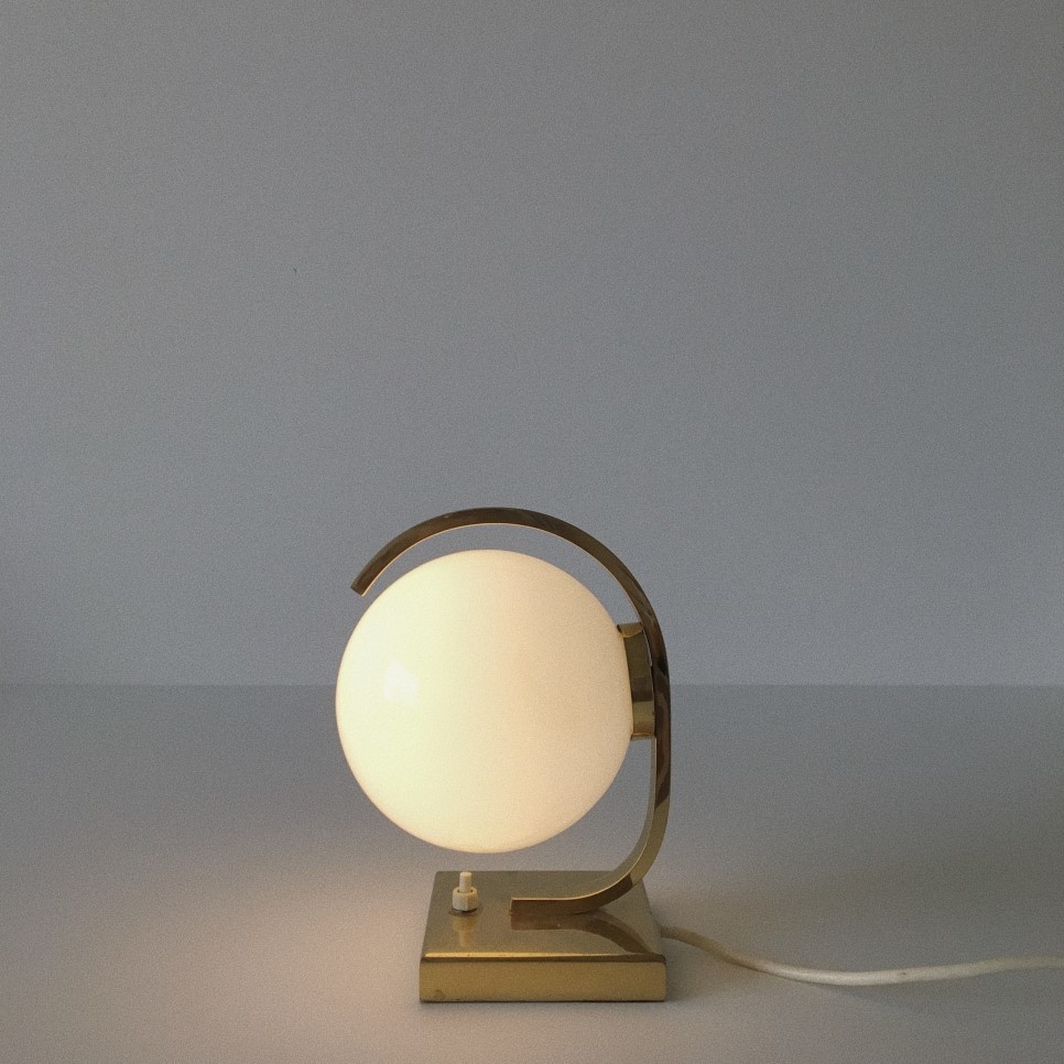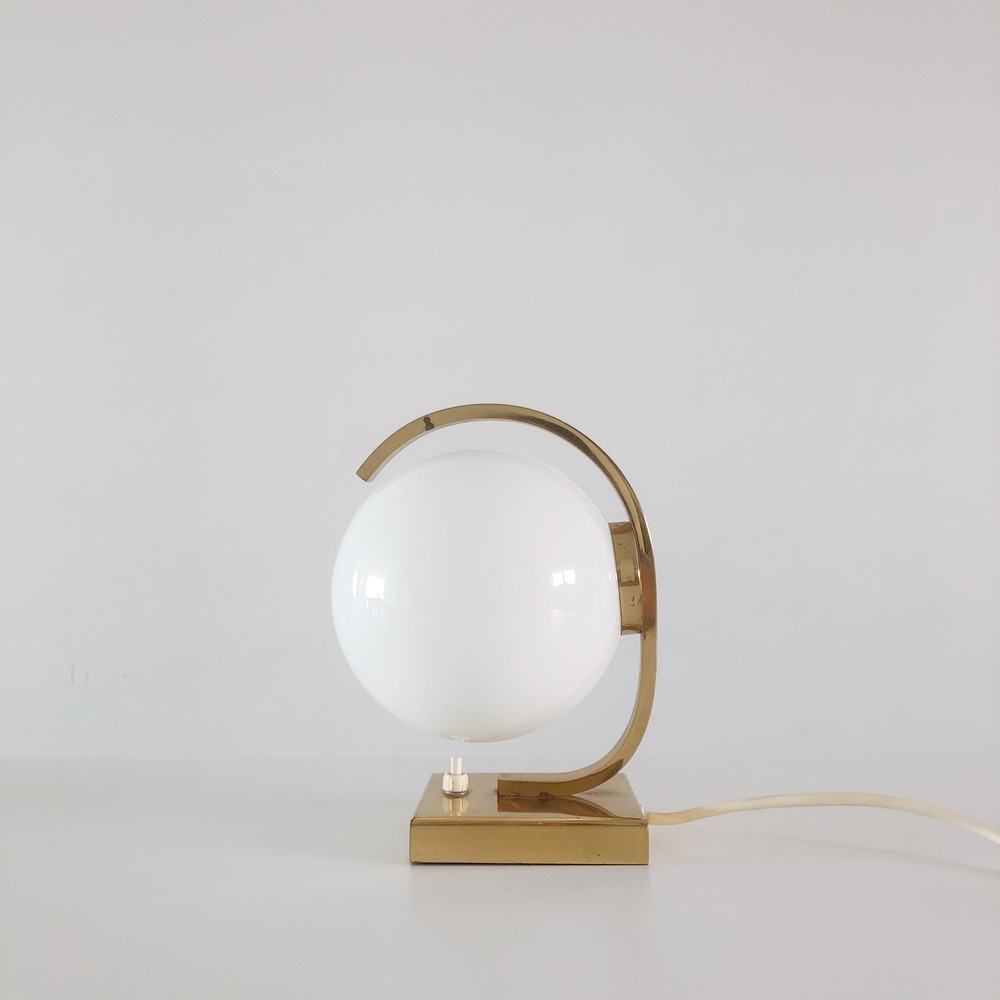 완전한 구 형태로 이루어진 램프의 셰이드와 브라스소재의 바디가